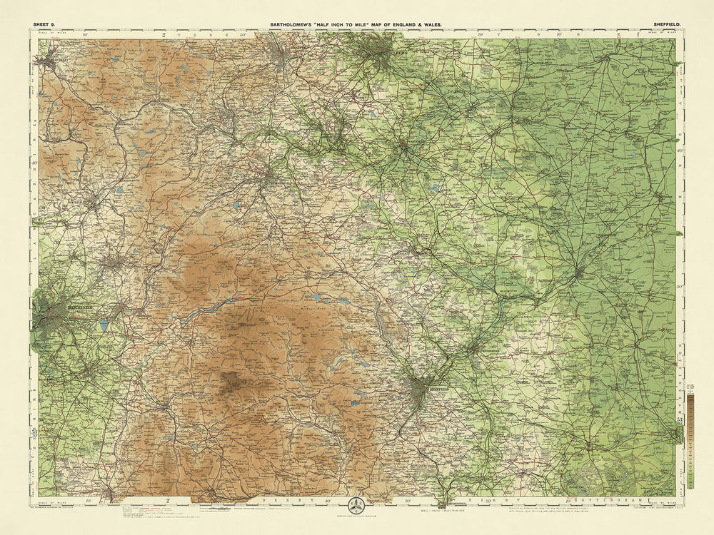 La feuille 9 - Sheffield de Bartholomew n'est pas seulement une carte ; c'est un document historique qui offre une fenêtre sur le passé. Elle capture l'essence de la géographie de la région, des collines ondulantes et des vallées verdoyantes aux villes animées et aux rivières tranquilles. Cette carte est une célébration de la riche tapisserie de l'histoire naturelle et humaine qui définit le centre et le nord de l'Angleterre, en faisant un ajout précieux à toute collection de cartes historiques.