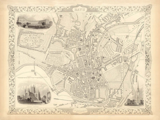 Gravé par John Rapkin et publié par J. Tallis & Co en 1851, il s'agit de l'une des cartes historiques de Bath les plus fines et les plus détaillées que l'on puisse trouver à l'apogée de la Grande-Bretagne victorienne industrialisée.