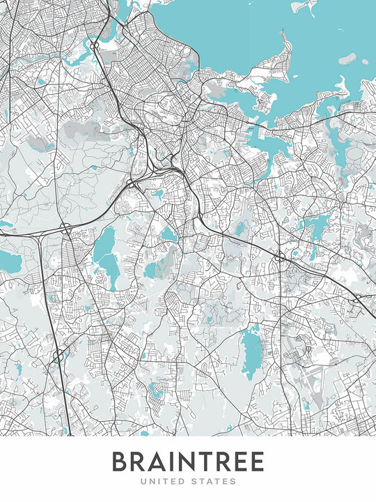 La carte met également en évidence plusieurs quartiers notables de Braintree, notamment Braintree Highlands, East Braintree, French's Corner, Hollis Heights, North Braintree, South Braintree, Sunset Lake, Thayer Gardens et West Braintree. Chaque quartier possède son caractère et son charme uniques, contribuant à la riche tapisserie de cette ville remarquable.