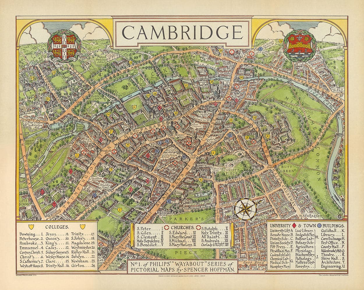 Les légendes le long du bord inférieur de la carte vous aident à identifier les différents collèges, églises, monuments et autres bâtiments universitaires de Cambridge. Regardez de près et vous pourrez repérer presque tous les différents collèges de Cambridge (sauf ceux fondés après 1929, bien sûr). Peterhouse, Pembroke, Clare, Trinity Hall, Corpus Christi, Magdalene, King's, Queens', Jesus, Christ's, St John's, Trinity, Downing, Newnham - ils sont tous ici, et bien d'autres encore.
