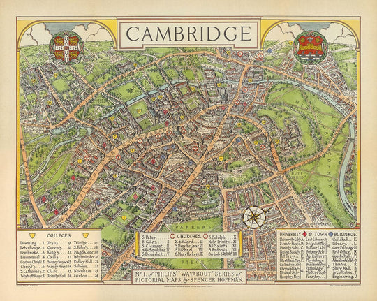 Ancienne carte de Cambridge, 1929: Trinité, St John's, King's, Peterhouse, Jésus