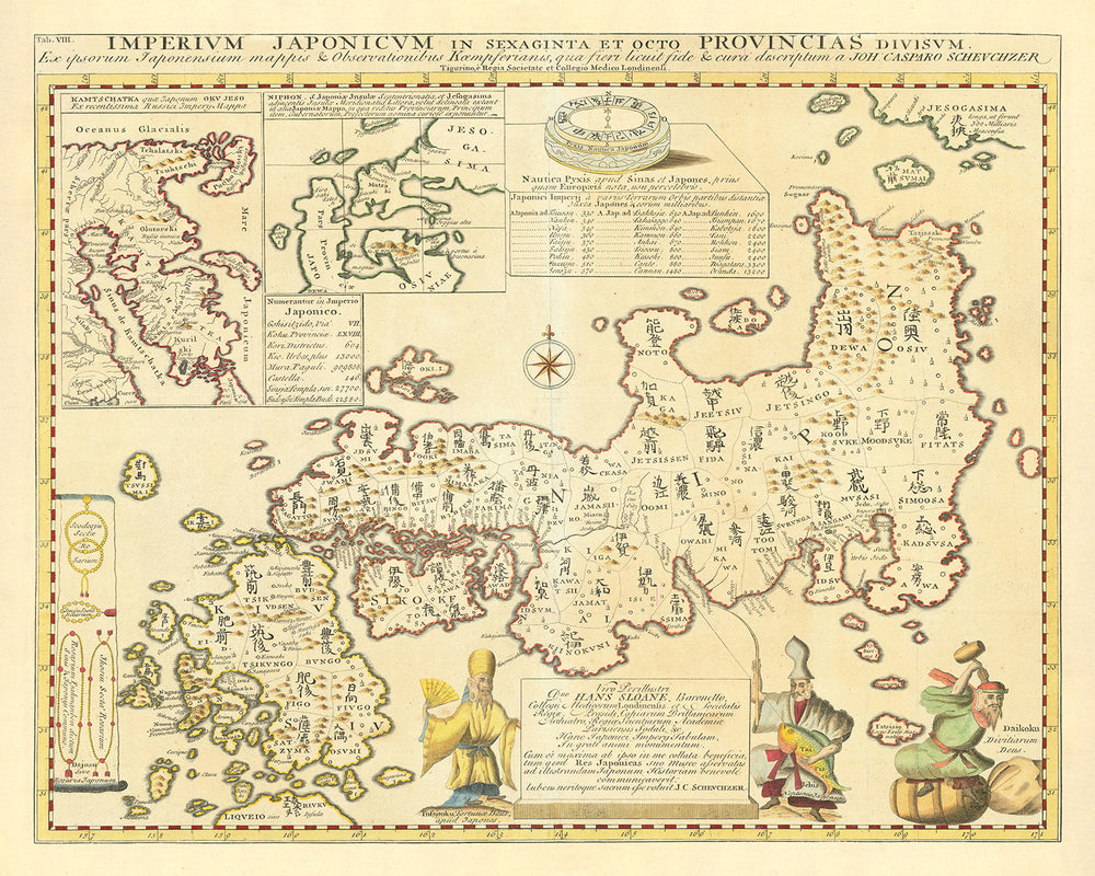 Il s'agit d'une ancienne carte du Japon, réalisée par Engelbert Kaempfer en 1727. Kaempfer était un médecin et naturaliste allemand qui fut autorisé à visiter le Japon pendant la période Edo, lorsque le pays était fermé à la plupart des étrangers. Sa carte est l’une des cartes du Japon les plus précises et les plus détaillées réalisées avant le milieu du XIXe siècle.