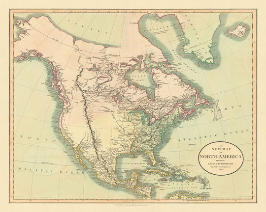 La carte est riche en caractéristiques géographiques, y compris les systèmes fluviaux complexes qui étaient cruciaux pour l'exploration et le développement du continent. Des majestueuses montagnes Rocheuses aux vastes côtes le long de l'Atlantique et du Pacifique, la carte de Cary délimite les contours naturels qui guideraient les pas des pionniers et des aventuriers. La représentation des systèmes fluviaux au-dessus des villages Pawnee sur le fleuve Missouri, informée par la carte d'Arrowsmith, met en lumière la quête d'un passage à travers les Rocheuses vers le Pacifique. Ce niveau de détail offre un aperçu fascinant des défis auxquels étaient confrontés les explorateurs et de l'importance des rivières dans l'expansion de la nation.