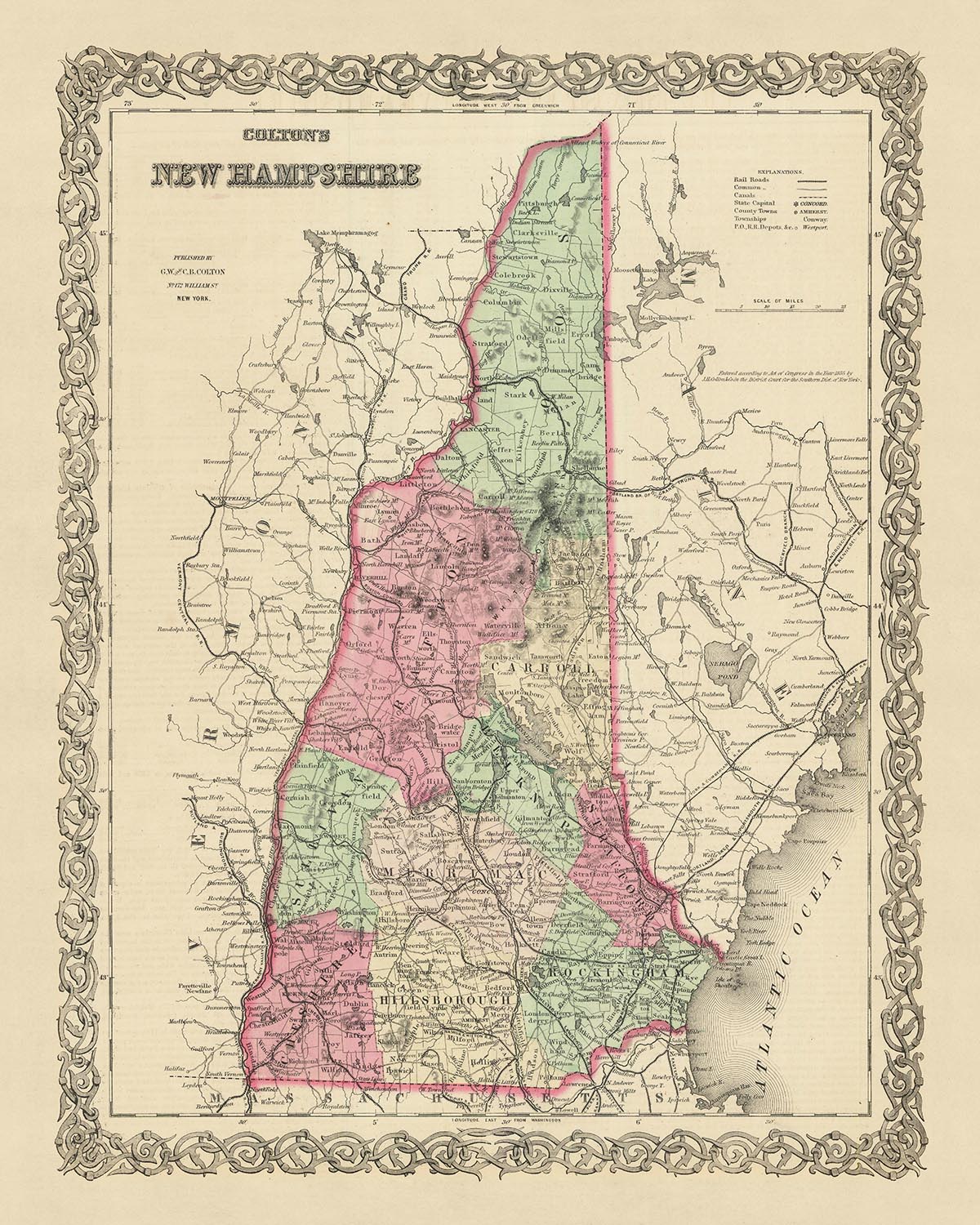Cette carte date d’une période de l’histoire américaine où la nation en était encore à ses balbutiements. Le milieu du XIXe siècle a été une période de changement et d’expansion importants, et cette carte constitue un instantané de cette époque. Le New Hampshire, l’une des 13 colonies originales, était encore en développement et en évolution. Bon nombre des colonies que nous reconnaissons aujourd'hui n'avaient pas encore été fondées, et les noms et les frontières que nous connaissons aujourd'hui ont probablement subi des changements considérables au cours des 150 dernières années.