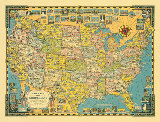 Il y a littéralement des centaines de petites illustrations très détaillées de tous les principaux monuments du pays - comme le Rose Bowl à Los Angeles, l'arbre le plus haut du monde dans le nord de la Californie, et le mémorial Lincoln à Washington DC. Un joli cartouche, flanqué de deux aigles chauves, indique le nom de cette carte : "America the Wonderland."