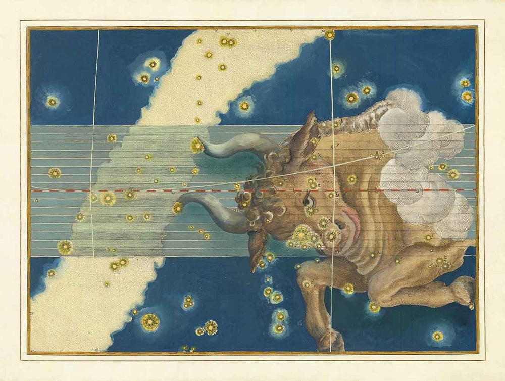 Cette carte des étoiles a été publiée à l'origine en 1603 dans l'"Uranometria" de Johann Bayer, peut-être l'atlas des étoiles le plus influent jamais publié et le précurseur de tous les atlas modernes des étoiles. Il contenait 51 cartes des étoiles très précises, dont 48 étaient les constellations ptolémaïques. Et, bien sûr, les 12 signes majeurs du zodiaque, y compris ce joli Taureau, étaient tous inclus.