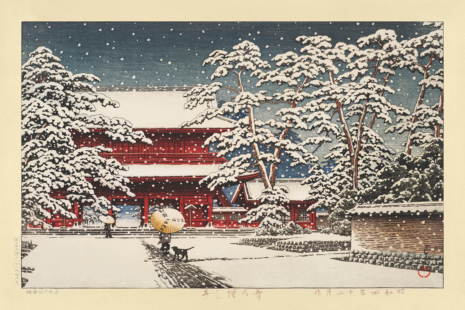 Présentation de "Le temple Zojoji sous la neige, Tokyo" par Hasui Kawase—un exemple exquis de l'art de l'estampe japonaise moderne à son meilleur. Cette œuvre atmosphérique, connue en japonais sous le nom de 「雪の増上寺」 (Yuki no Zojoji), a été créée en 1929 et capture le temple historique Zojoji au milieu d'une paisible chute de neige. Hasui Kawase, une figure emblématique du mouvement shin-hanga ("nouvelles estampes"), a magistralement combiné le savoir-faire traditionnel ukiyo-e avec une élégante modernité, insufflant à ses compositions un profond sens du temps et une émotion sereine.