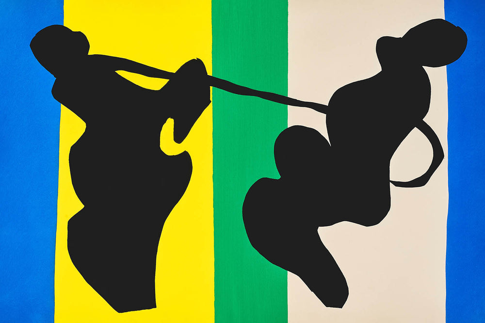 Henri Matisse, salué comme l'un des plus grands coloristes du 20ème siècle, a révolutionné l'art moderne avec ses œuvres abstraites qui mêlaient palettes joyeuses et formes expressives. "Le cow-boy" est un exemple parfait de son éclat en fin de carrière, démontrant la liberté et l'audace qui ont défini ses peintures découpées. L'œuvre porte la palette de couleurs signature de Matisse, dominée par un jaune vibrant, un vert luxuriant et un bleu profond, qui évoquent ensemble un sentiment d'harmonie et de mouvement.