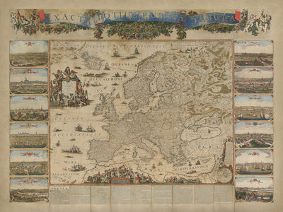Le design de la carte est un témoignage de la réputation de la famille Visscher pour l'excellence en cartographie. Nicolaes Visscher II, suivant les traces de son père et de son grand-père, a infusé cette carte à la fois d'une précision scientifique et d'un flair artistique. La projection cartographique présente la géographie de l'Europe avec une clarté remarquable, tandis que l'inclusion de vues de villes et d'annotations fournit un riche contexte historique. Ce double accent sur l'esthétique et l'information illustre l'âge d'or néerlandais de la cartographie, une période où les cartes étaient autant des récits que des outils de navigation.