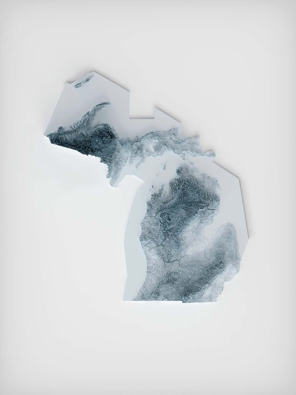 Les lacs dominent la scène, avec les frontières emblématiques du Michigan façonnées par les vastes eaux du lac Michigan, du lac Huron et du lac Supérieur. Le relief de la carte attire l'attention sur les pentes douces rencontrant les rivages sablonneux, les bords sculptés des anciennes moraines glaciaires, et les îles et péninsules qui parsèment les eaux des Grands Lacs. Dans la péninsule supérieure, les hauts plateaux accidentés et les falaises anciennes de la péninsule de Keweenaw captent la lumière, tandis que les vastes forêts nationales de Hiawatha et d'Ottawa sont évoquées dans les hauts plateaux texturés au loin.