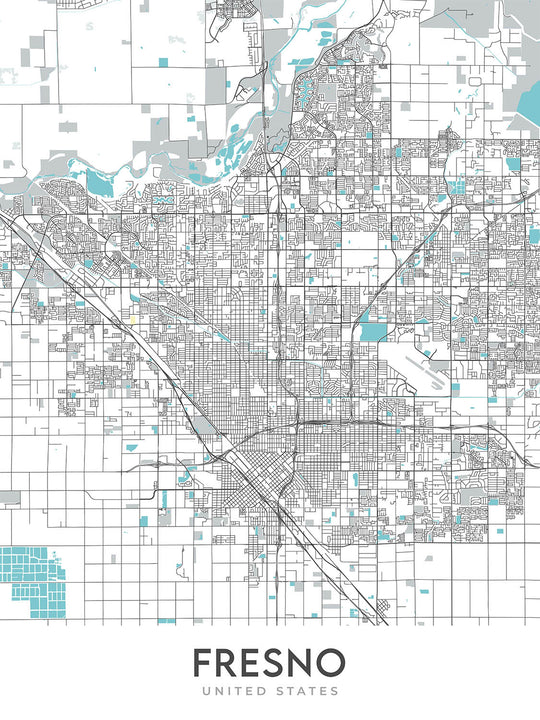 Cette carte de Fresno, Californie, est une carte moderne et détaillée des rues sans étiquettes, parfaite pour ajouter une touche de style contemporain à votre décoration intérieure. La carte couvre une zone rectangulaire qui englobe la ville de Fresno et ses environs, y compris Clovis, Sanger, Selma, Fowler, Kingsburg, Reedley, Orange Cove, Parlier, Del Rey, Easton, Caruthers, Riverdale, Laton, Raisin City, Mendota, Huron, Coalinga et Lemoore.