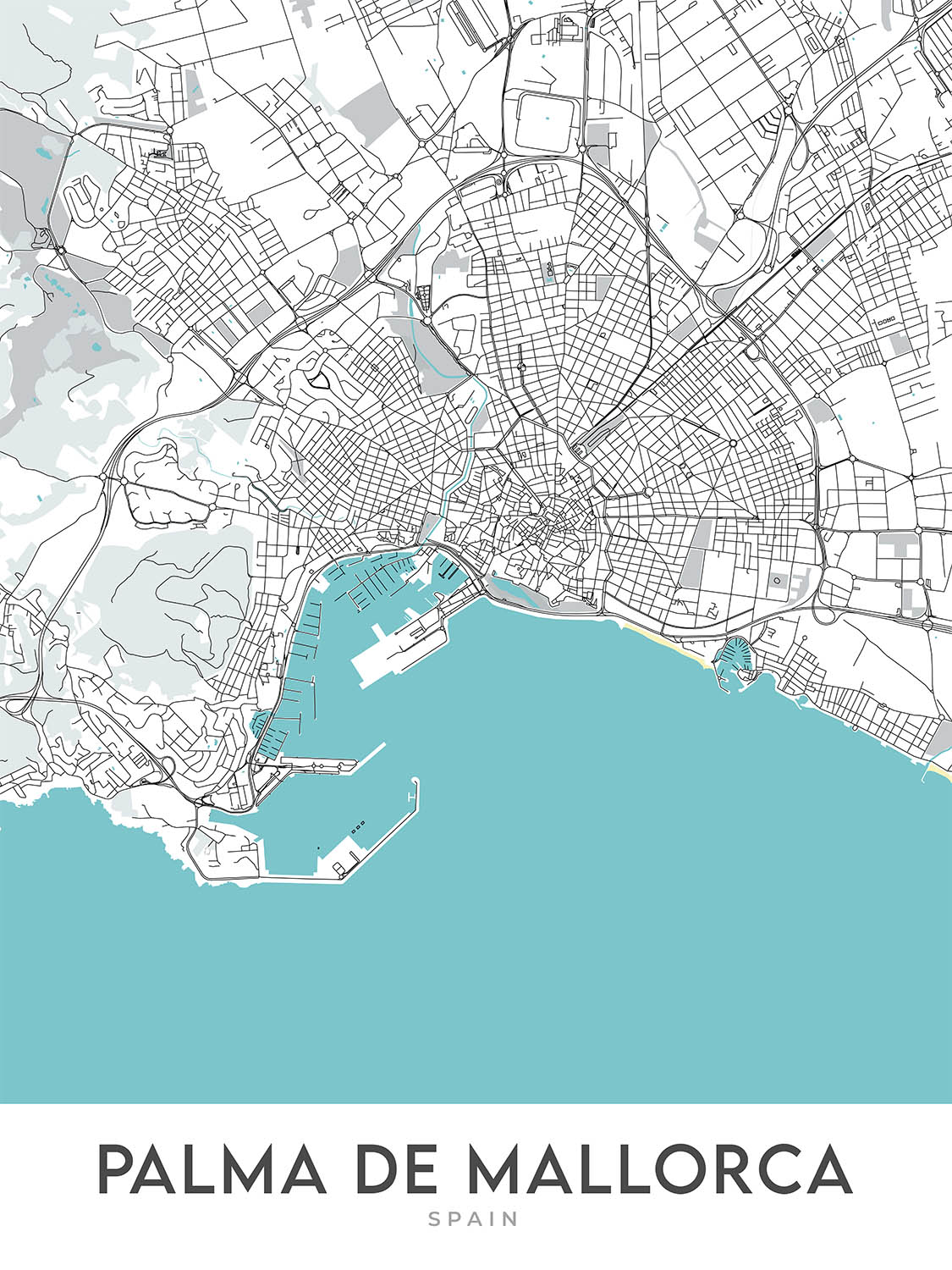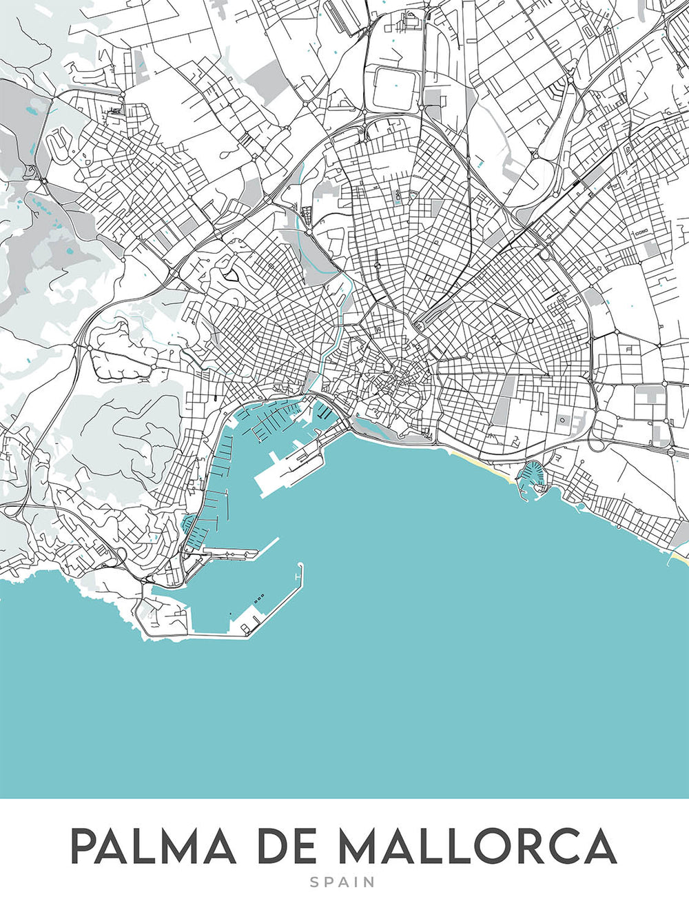 La carte couvre une partie substantielle de Palma de Majorque, englobant une diversité de quartiers et de monuments. Les zones notables incluent la vieille ville historique, connue pour son architecture gothique et ses charmantes places, ainsi que le quartier animé de Santa Catalina, réputé pour ses marchés vibrants et ses boutiques tendance. La carte s'étend également au Paseo Maritimo, une promenade en bord de mer pittoresque bordée de palmiers et offrant des vues à couper le souffle sur la mer Méditerranée.