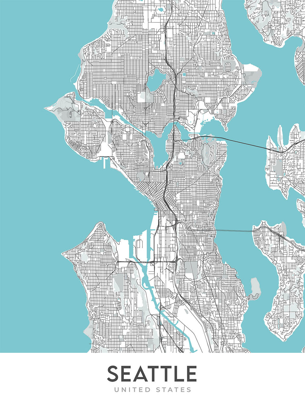 Plan de la ville moderne de Seattle, WA : Capitol Hill, Queen Anne, Belltown, Pike Place Market, Space Needle