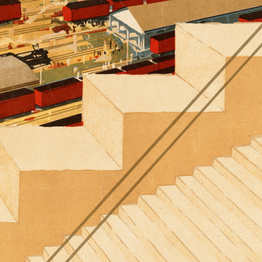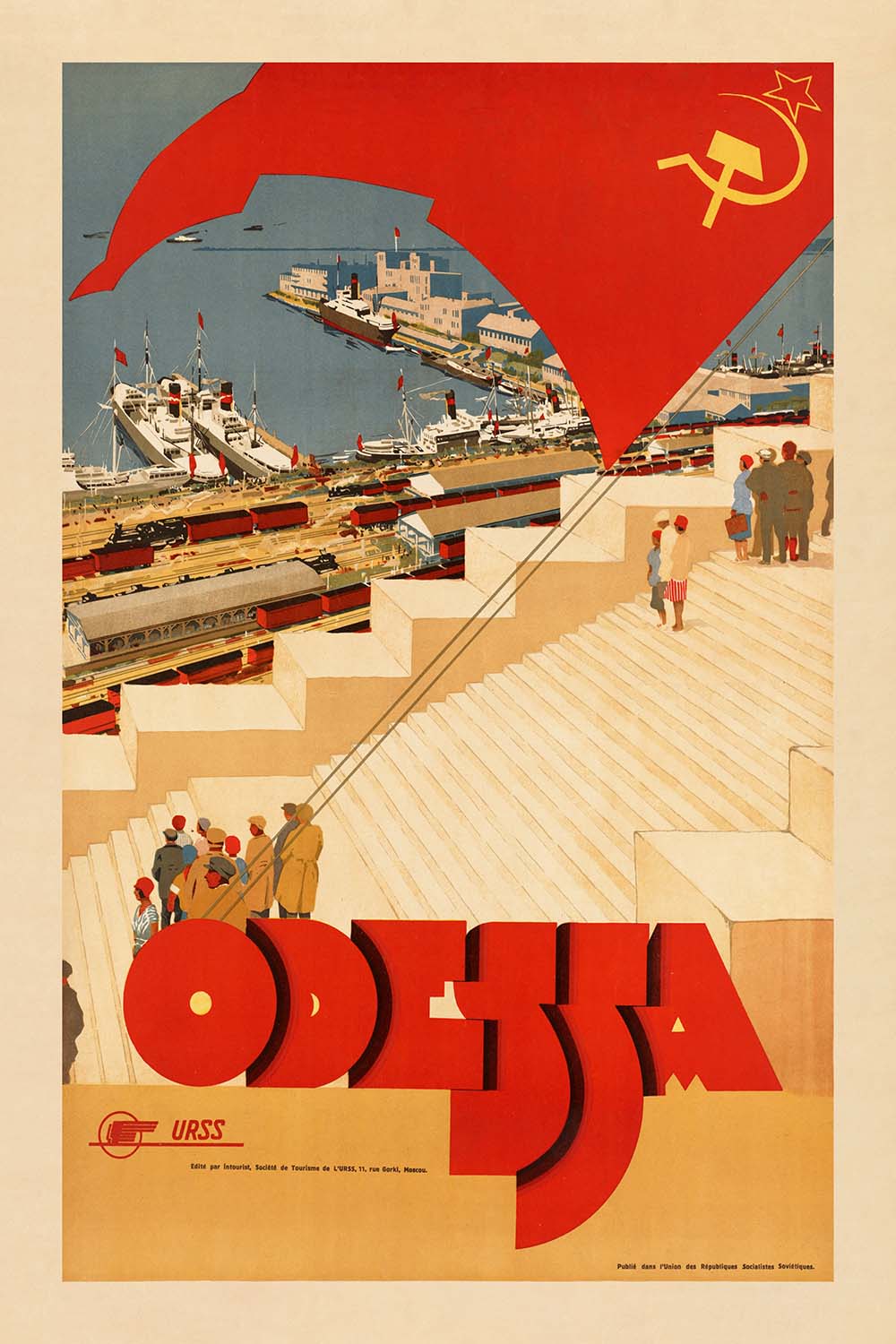 Design and color: The palette centers on warm beige, maritime blues, and emphatic reds—the last symbolically tied to the Communist Party and here expressed in a sweeping flag that drives the composition. Flat, unmodulated color fields and clean, structured forms ensure instant impact. The monumental ODESSA logotype anchors the scene, while the coastal setting is distilled to essential shapes, giving the work a timeless, architectural quality. The result is both a piece of graphic history and a fresh, modern accent—ideal for rooms with mid-century, industrial, or contemporary decor where a statement of color and form is welcome.