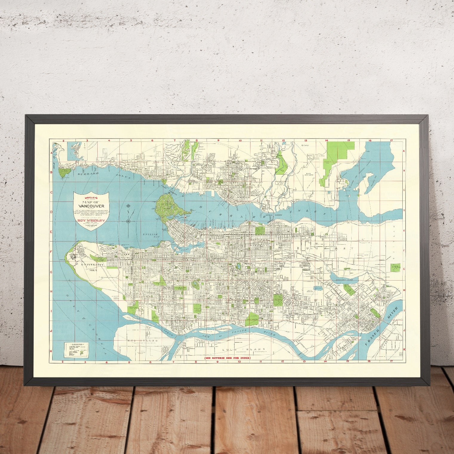 Wrigley’s New Revised Map of Vancouver, issued in 1947 by Roy Wrigley, captures a metropolis at a pivotal postwar moment with a cartographer’s precision and a promoter’s flair. A bold cartouche anchors the composition, while a crisply organized grid and vivid color blocks distinguish streets, parks, and waterways across Vancouver, New Westminster, Burnaby, West Vancouver, and Richmond. Conceived for both residents and visitors, it pairs practical clarity with inviting tourist notes and a thorough index for quick reference to neighborhoods and landmarks. As a city map, it excels at revealing how Vancouver coheres: a downtown core tied to radiating avenues, coastal promenades, and green sanctuaries, all set within an intricate coastal geography that dictated—then accelerated—its postwar expansion.