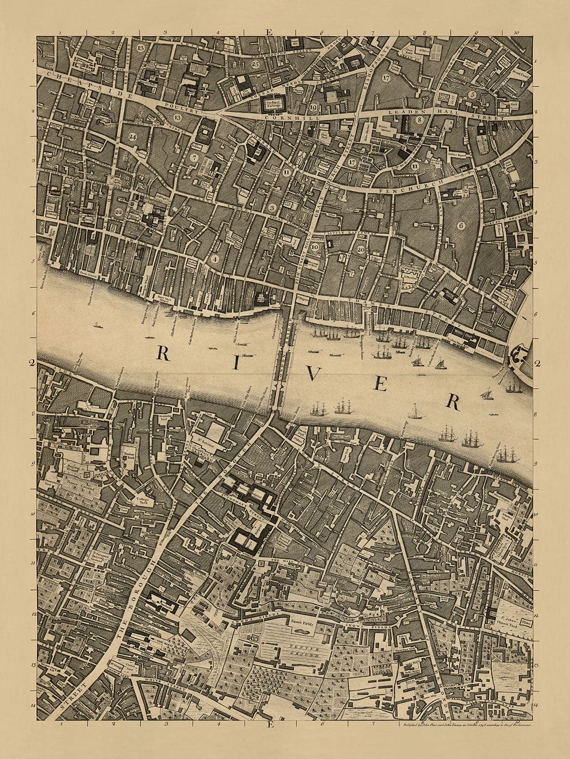 Cette carte a été publiée à l'origine dans 24 feuilles. La carte indiquée ici est la feuille E2, se concentrant sur la tronçon de Thames couvée par London Bridge, avec arrondissement du côté sud et ville de Londres du côté nord.