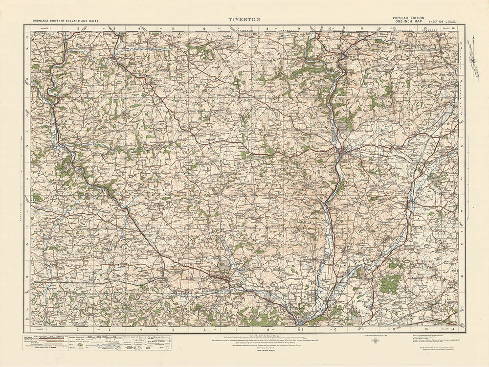 Carte Old Ordnance Survey, feuille 128: Tiverton, 1925 : Crediton, Cullompton, Bampton, Willand, North Tawton