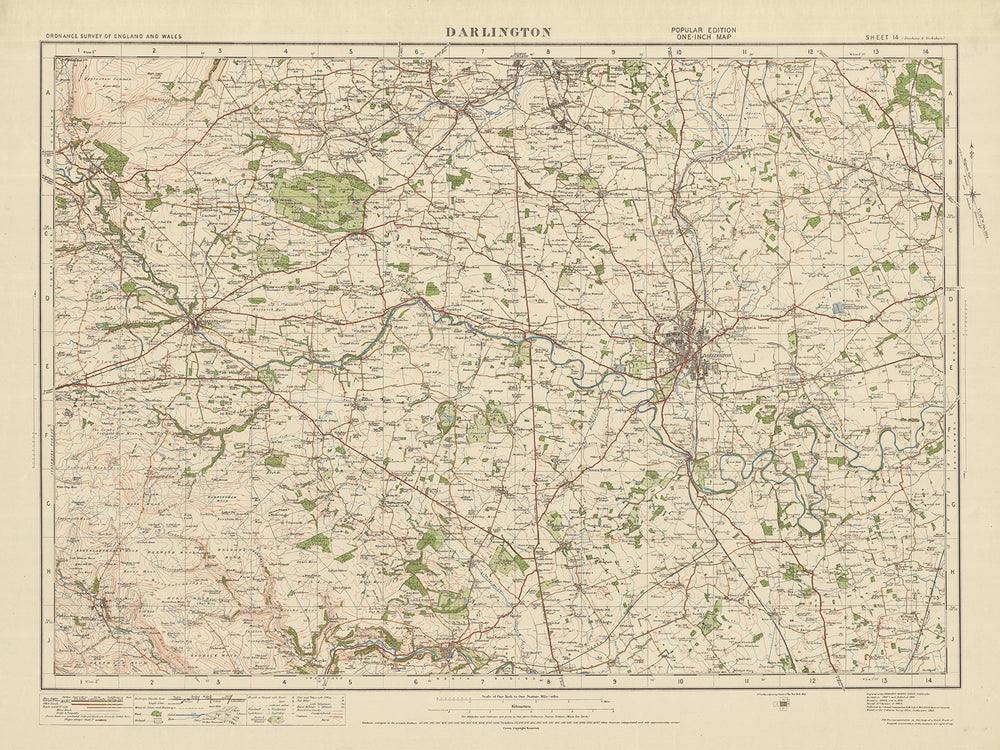 Cette ancienne carte, intitulée "Sheet 14 - Darlington", est une pièce remarquable de l'édition "populaire" d'un pouce de l'Ordnance Survey, Angleterre et Pays de Galles, publiée en 1925. La carte présente le comté historique de Darlington, donnant un aperçu fascinant du passé. Elle inclut plusieurs villes et caractéristiques intéressantes, telles que Newton Aycliffe, Shildon, Richmond, Barnard Castle et St Helen Auckland.