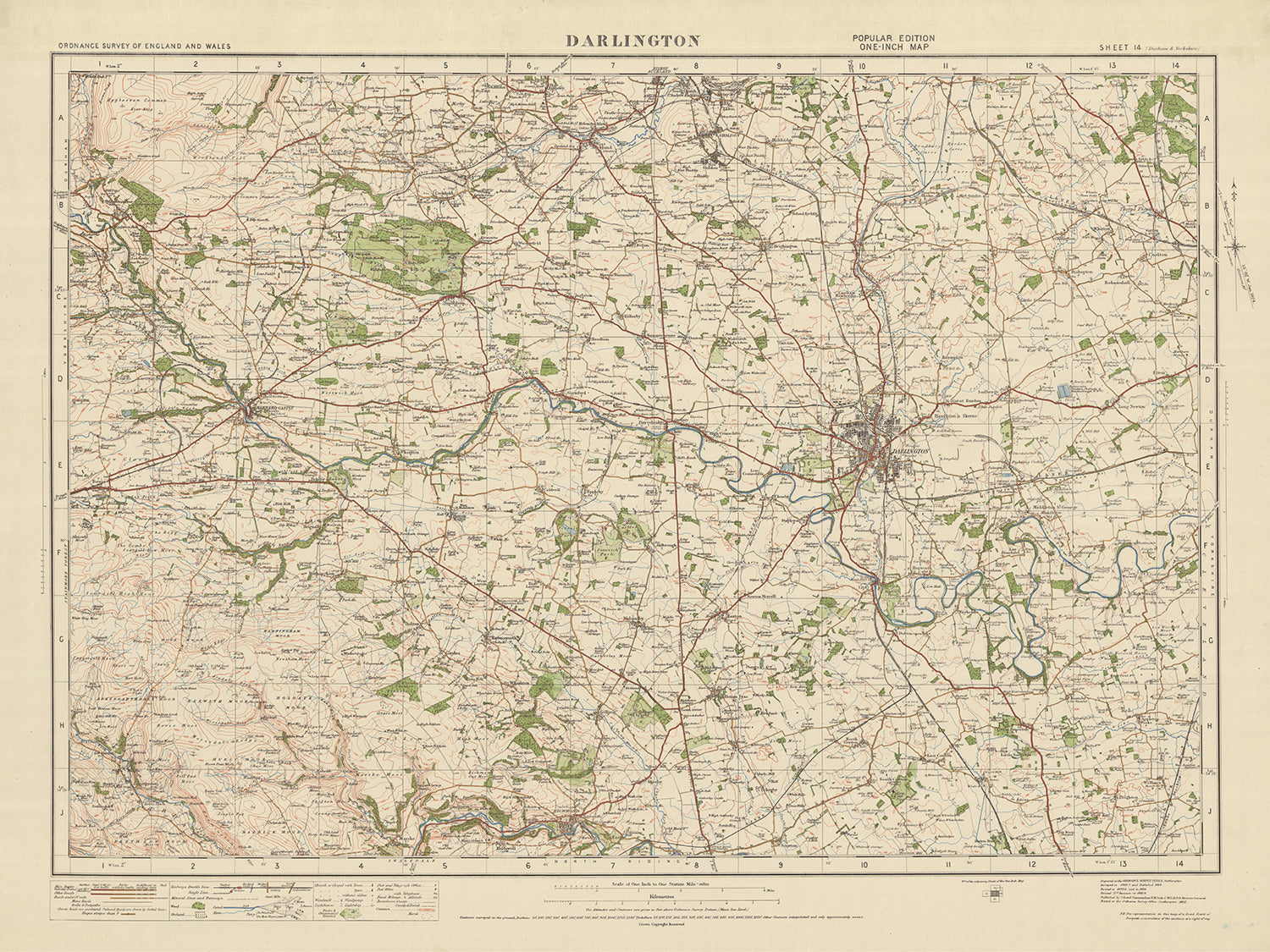 Ancienne carte de l'Ordnance Survey, feuille 14: Darlington, 1925 : Newton Aycliffe, Shildon, Richmond, Barnard Castle, St Helen Auckland
