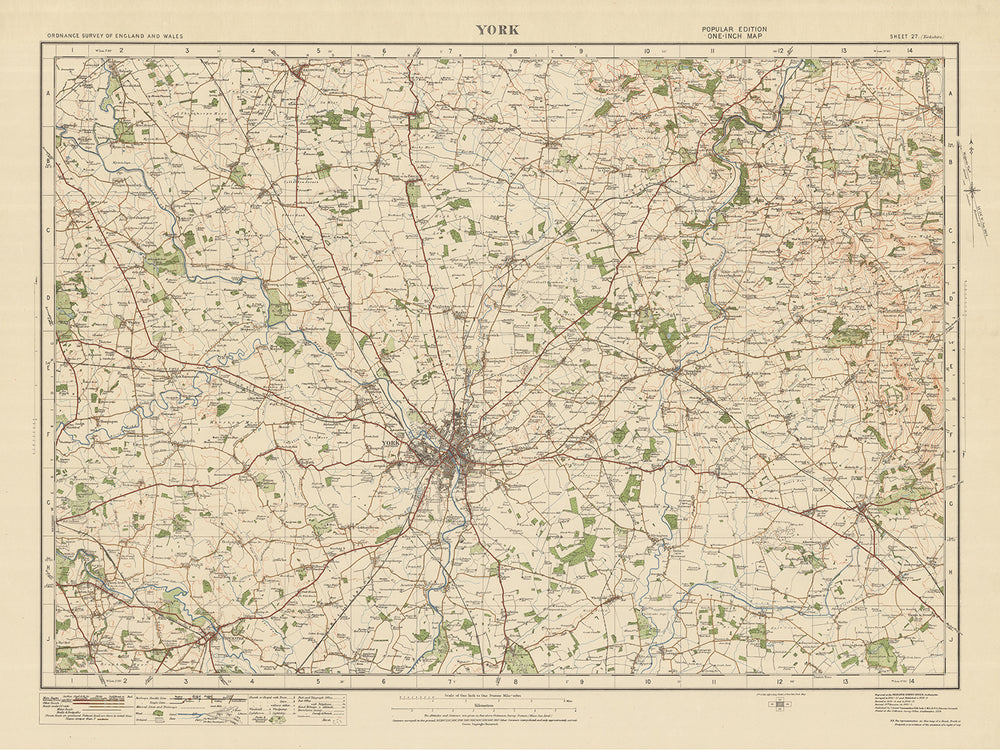 Explorez l'ancienne carte de l'Ordnance Survey, feuille 27 - York, 1925, et plongez dans la tapisserie historique de cette région captivante, en découvrant ses villes, ses rivières et les événements importants qui ont façonné son passé.