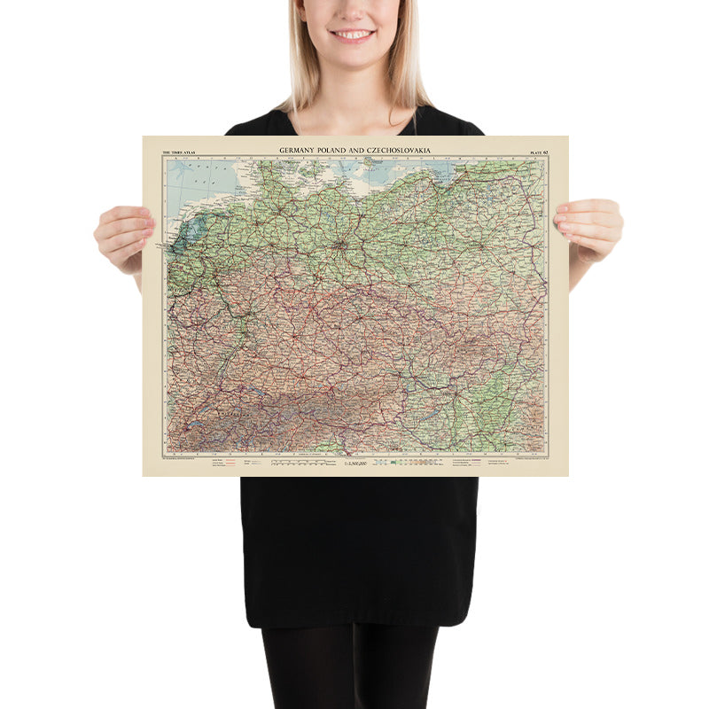 Originally titled “Germany, Poland and Switzerland” (Plate 62, Volume III), this 1955 chart from The Times Atlas of the World captures Central Europe at a decisive mid-century juncture. John Bartholomew’s hand is evident in the union of political clarity and physical drama: borders are crisply drawn while shaded relief and gentle gradient tints lift the Alps, Sudetes, and Black Forest from the page. Provinces and regions are labeled with scholarly precision, from Bavaria and Saxony to Silesia and Masovia, and the road network is color-keyed to anchor the great cities—Berlin, Hamburg, Munich, Warsaw, Kraków, Zurich, Geneva—within their landscapes. Rivers and lakes are traced with hydrological nuance, and maritime gradients fringe the North and Baltic seas, inviting both study and quiet admiration.