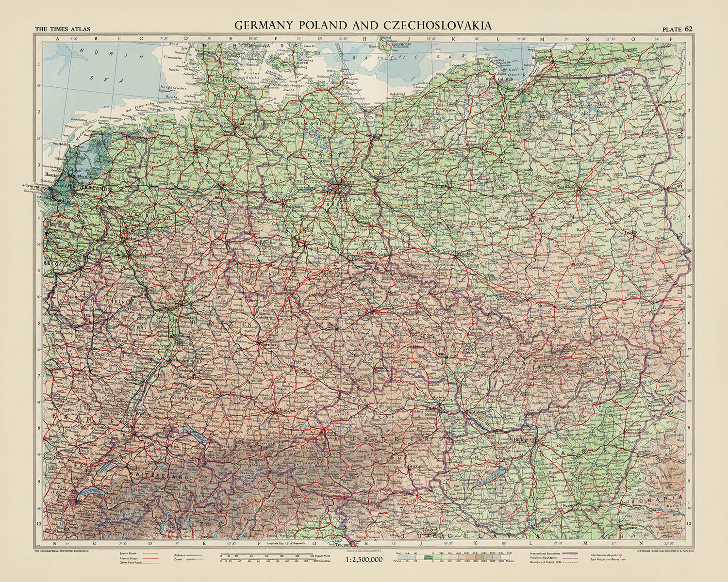 Switzerland provides a mountainous counterpoint, rendered with the luminous subtlety that Bartholomew reserved for high relief. The Alps surge in tonal bands from the Bernese Oberland to the Grisons, while the Jura scarp shadows the French frontier. Zurich, Geneva, Basel, Bern, Lausanne, and Lucerne are set beside the lucid waters of Lakes Geneva and Lucerne, with Lake Zurich and the Rhine’s headwaters precisely fixed by the graticule. Cantonal boundaries are etched with dignified restraint, reflecting a federal mosaic shaped by valleys, passes, and watersheds. North–south corridors and transalpine routes are suggested in the road network, emphasizing Switzerland’s role as a hinge of continental exchange. Throughout, the Greenwich-referenced coordinates and mid-century design clarity transform complex relief and borders into an enduring, navigable portrait of Central Europe.