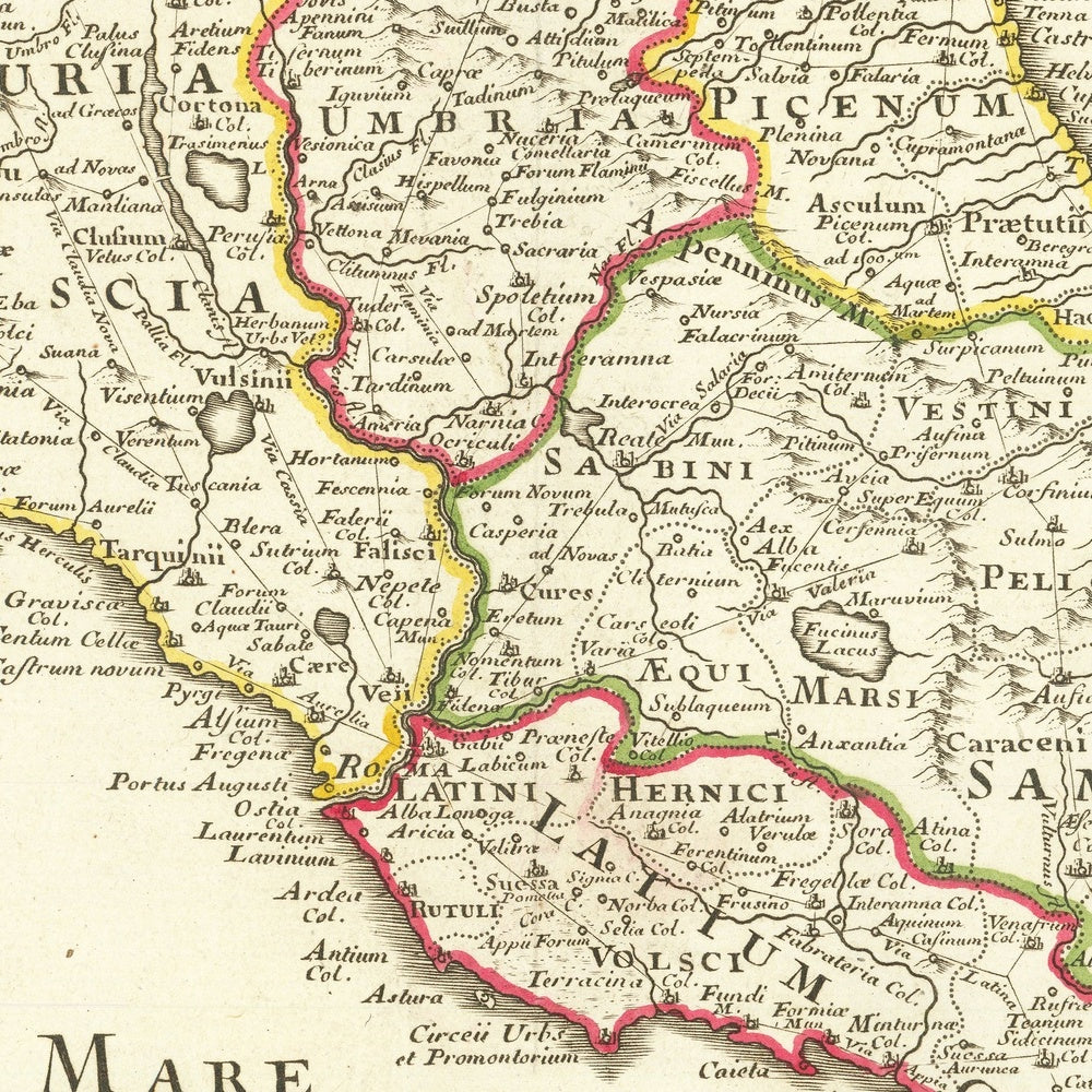 At its core is Augustus’s elevenfold division of the peninsula—Latium et Campania, Etruria, Umbria, Picenum, Samnium, Aemilia, Liguria, Venetia et Histria, and Transpadana among them—each cleanly distinguished and anchored by emblematic cities. Rome reigns at the center, with Ostia guarding its maritime lifeline and Capua, Naples, and Pompeii punctuating fertile Campania. In Etruria, Tarquinia, Veii, Volterra, Siena, and Arretium reveal an ancient heartland woven into Roman order. Northward, Bologna marks Aemilia’s arterial corridor, while Genoa fronts Liguria’s coast, and Milan, Pavia, Verona, and Aquileia attest to the strategic weight of the Po Valley and the Adriatic rim. The map notes differing civic statuses—from municipia to coloniae—signaling the legal gradations that underpinned Roman governance.