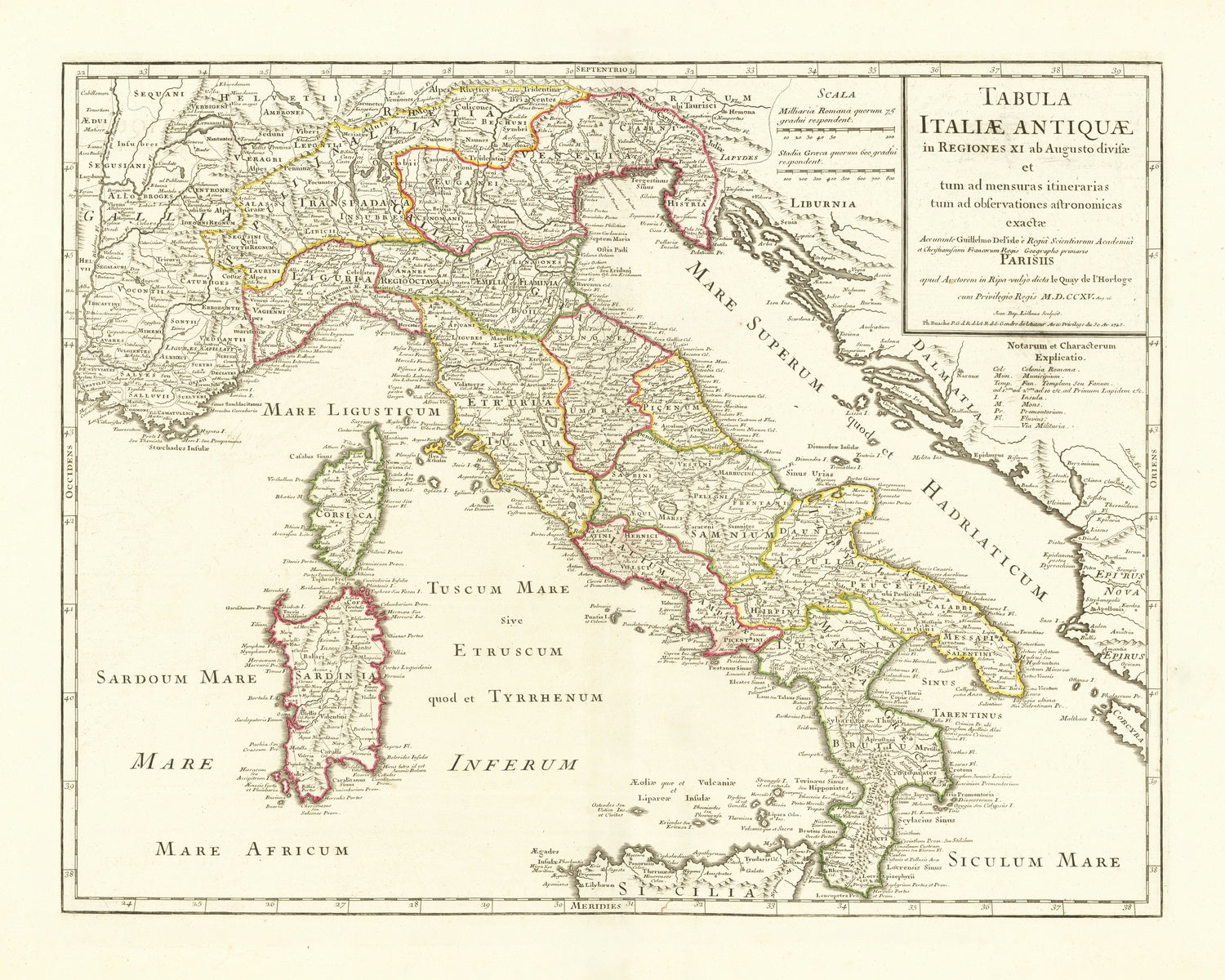 Tabula Italiae Antiquae in Regionis XI ab Augusto divisae, engraved in 1715 by Joanne Baptiste Liebaux for Guillaume De L’Isle and later imprinted by Philippe Buache, is a learned reconstruction of Italy at the dawn of the Roman Empire. With color-coded provinces and a title cartouche that signals its scholarly ambition, the map unites classical erudition with early Enlightenment science, “exacta” both to itinerant measurements and astronomical observations. Rivers, mountains, and coastlines are rendered with crisp clarity, while inscriptions fix the locations of storied towns across the peninsula and Sicily. The result is a rare, authoritative vista of Augustan Italy—an administrative and geographic portrait that allowed antiquarians and statesmen alike to read imperial structure directly on the land.