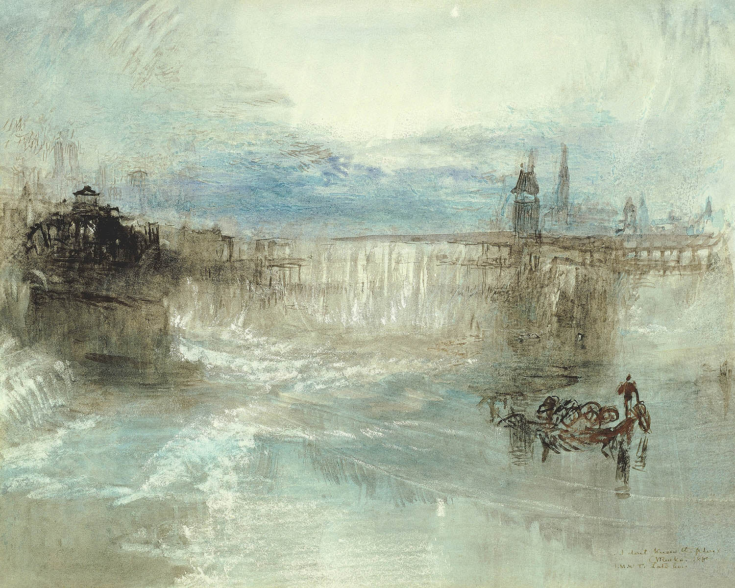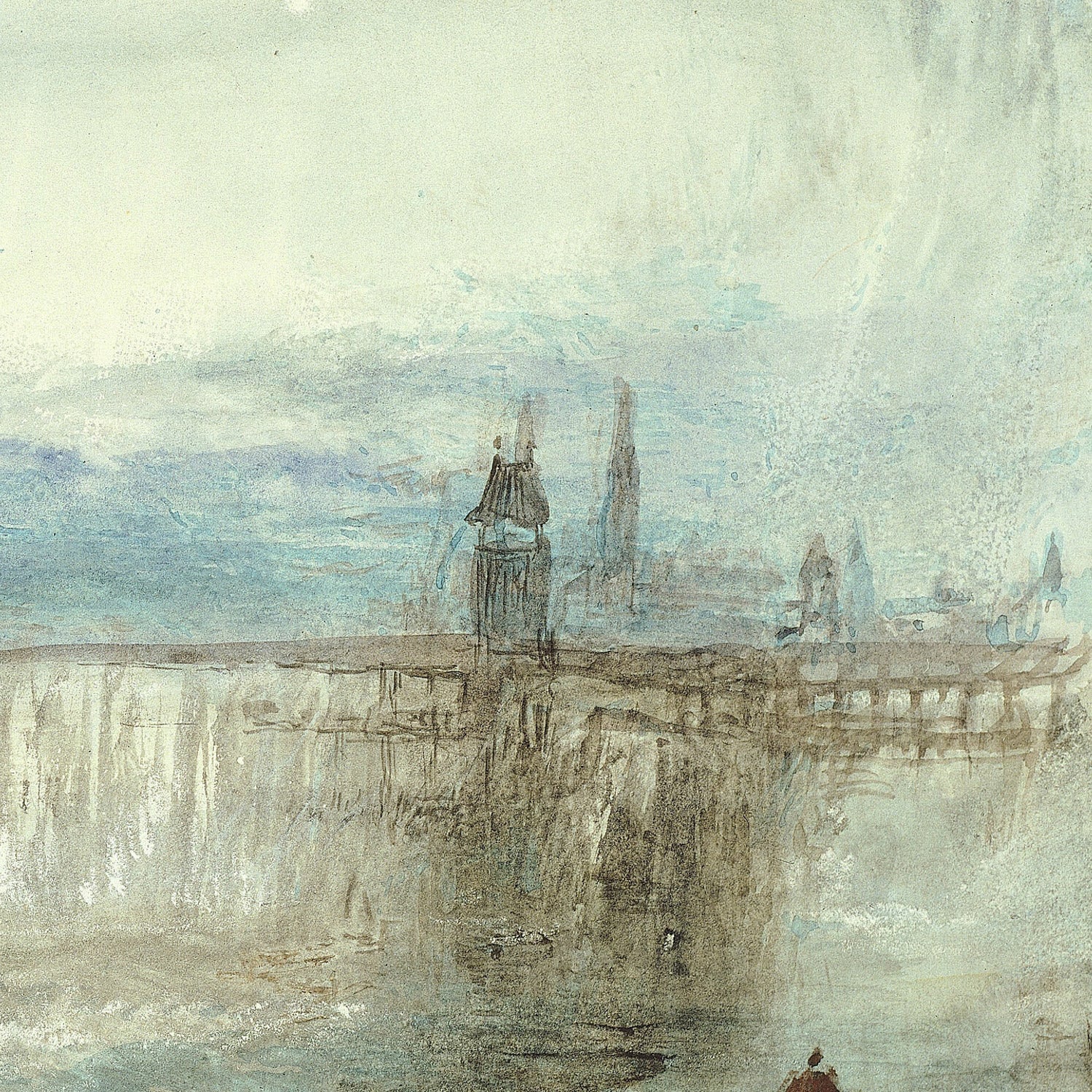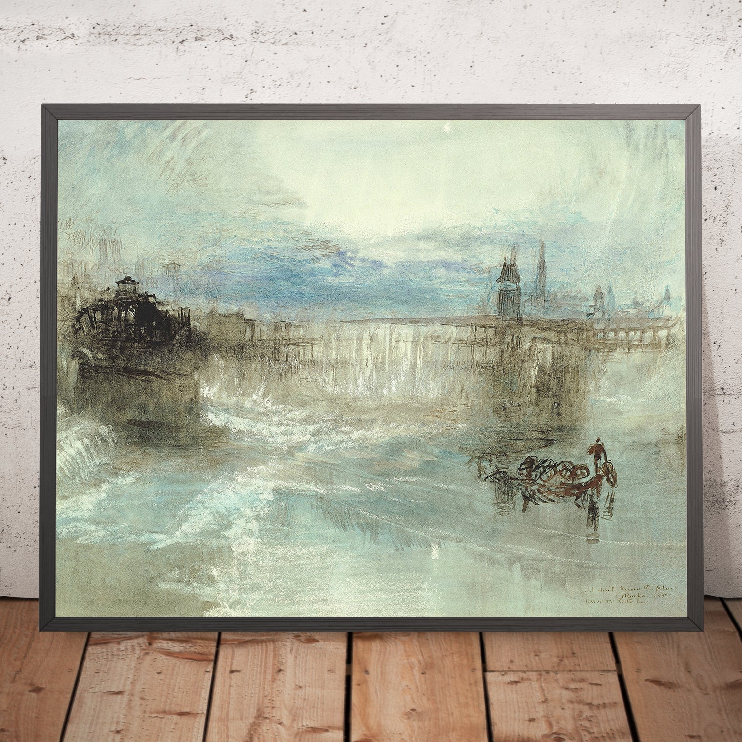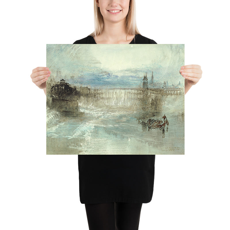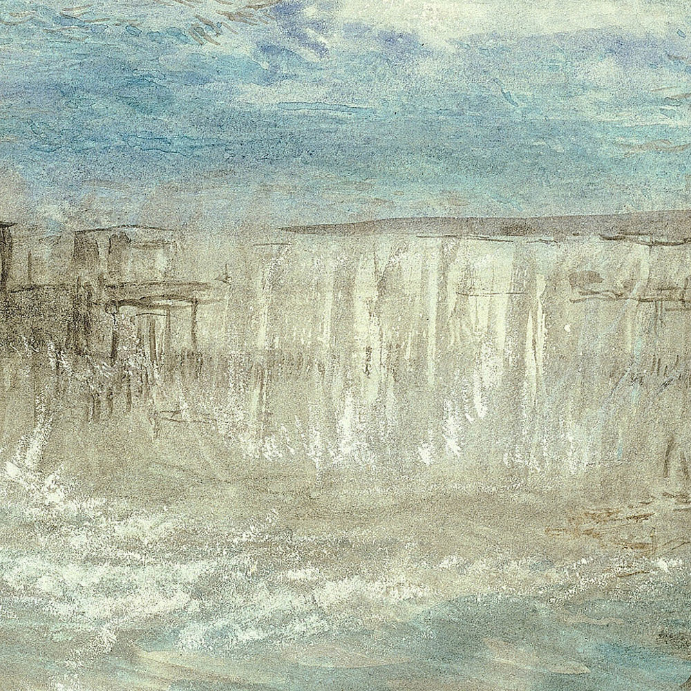 The color work here is exquisite. A dominant field of soft, sky-washed blue merges with pearly whites, while gauzy layers of gray and muted brown steady the composition with gentle warmth. Turner’s fluid, wet-into-wet handling allows pigments to bloom and mingle, suggesting drifting cloud banks and a lake surface that stirs almost imperceptibly. The atmospheric perspective is masterful: forms become suggestions, depth is created through tone rather than line, and the entire scene glows as if lit from within. It’s a serene statement piece that brings clarity and calm to contemporary interiors, from minimalist living rooms to restful bedrooms and refined offices.