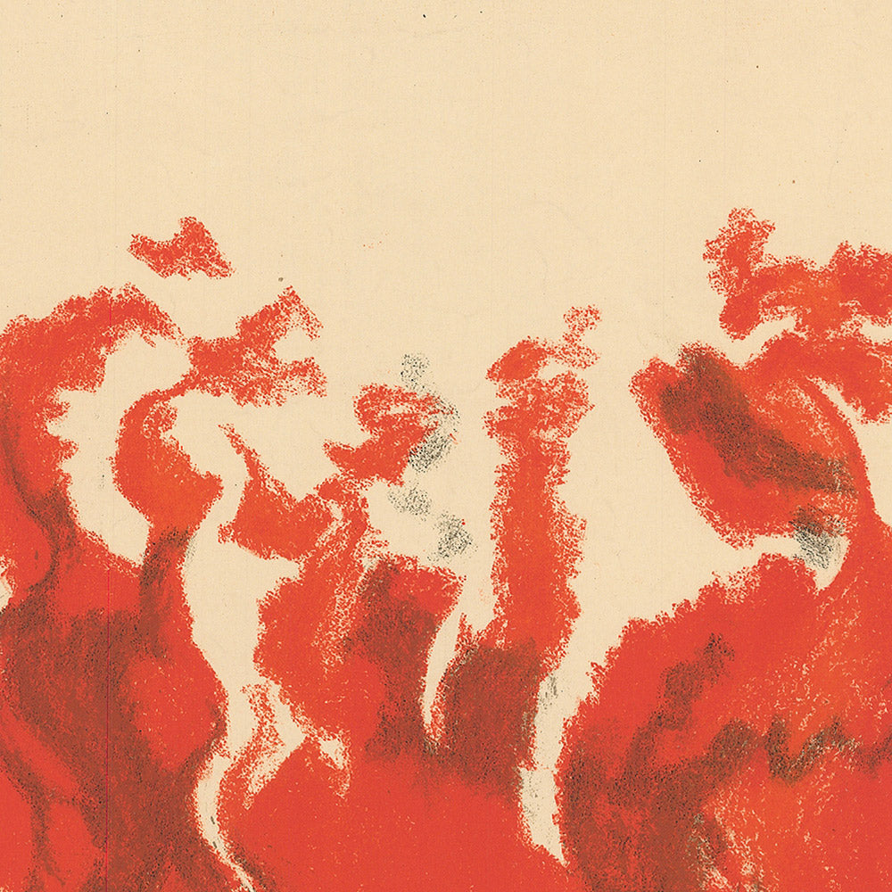 Visually, the poster is a masterclass in economy and mood. The beige field feels like aged parchment; the black hand-lettered capitals form a rhythmic frame; and the red-orange plume of fire, painted in loose, expressive strokes, injects warmth and motion. The symmetrical iron uprights, the small crank handle on the right, and the monogram at lower right add tactile detail without clutter. With its restrained palette of beige, red, and black, the composition reads crisply across a room—perfect for kitchens, dining rooms, and contemporary spaces that enjoy a vintage accent.