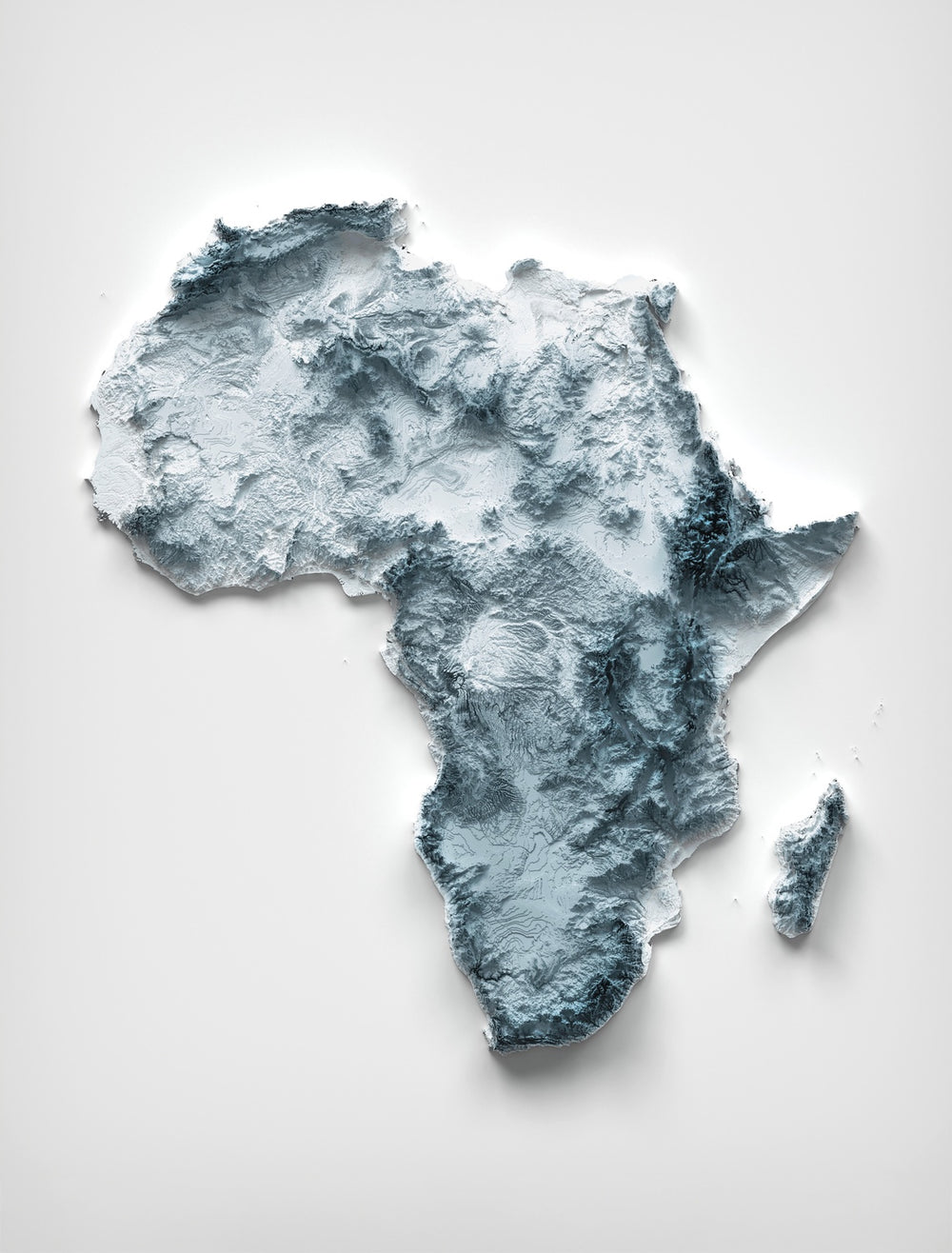This is a minimalist topographical relief map of Africa, created by The Unique Maps Co. and enhanced with our trademarked “Unique 3D” process. There are no labels, no roads, and no towns — only the continent’s form, revealed by carefully modeled light and shadow that draw out high peaks, deep basins, and the sweeping plateaus in between. From the Atlantic to the Indian Ocean, from the Atlas to the Cape, the land’s structure rises and falls in crisp relief.