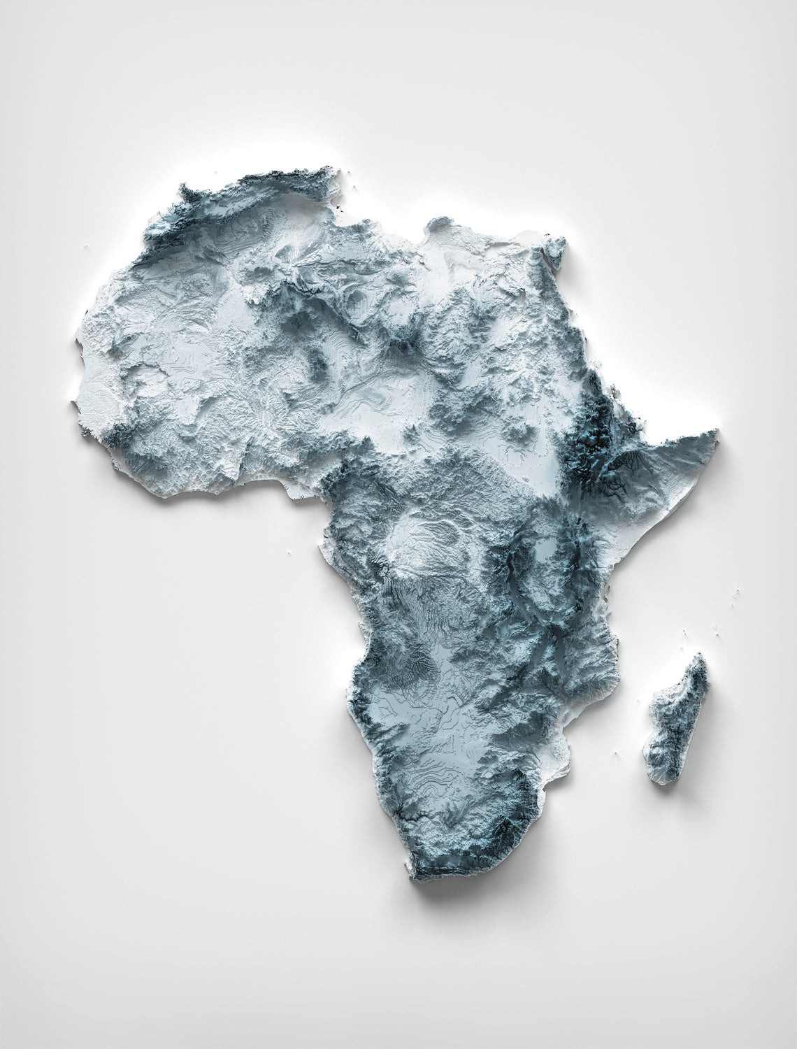 Across West Africa, uplands and plateaus punctuate the savannas: the Fouta Djallon and Guinea Highlands, the Loma Mountains, and Nigeria’s Jos Plateau all lean into surrounding plains. The Niger’s great inland delta spreads as a shallow basin before the river gathers itself again, while the low, rolling coastal belts of the Gulf of Guinea lead the eye back to the continent’s margins. Throughout, the absence of labels invites you to navigate by memory and feeling — to trace journeys along rivers, climbs up escarpments, and crossings over wide basins guided purely by the play of light and shadow.