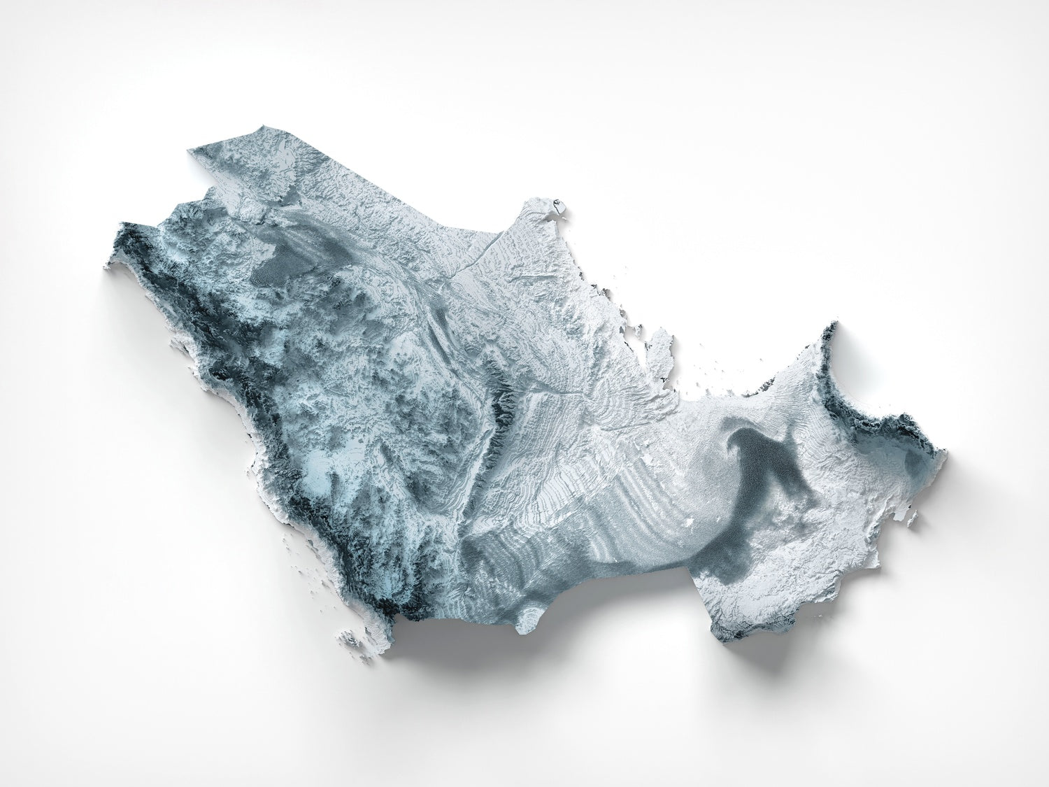 This is a minimalist topographical relief map of the Gulf countries, created by The Unique Maps Co. and enhanced with our trademarked Unique 3D process. There are no labels, no roads, and no towns — the landforms speak for themselves. Raking light and delicate shadow reveal the region’s sweeping deserts, serrated mountains, fossil plateaus, and coastal flats, letting you trace familiar horizons and rediscover the shapes that define life along the Gulf.