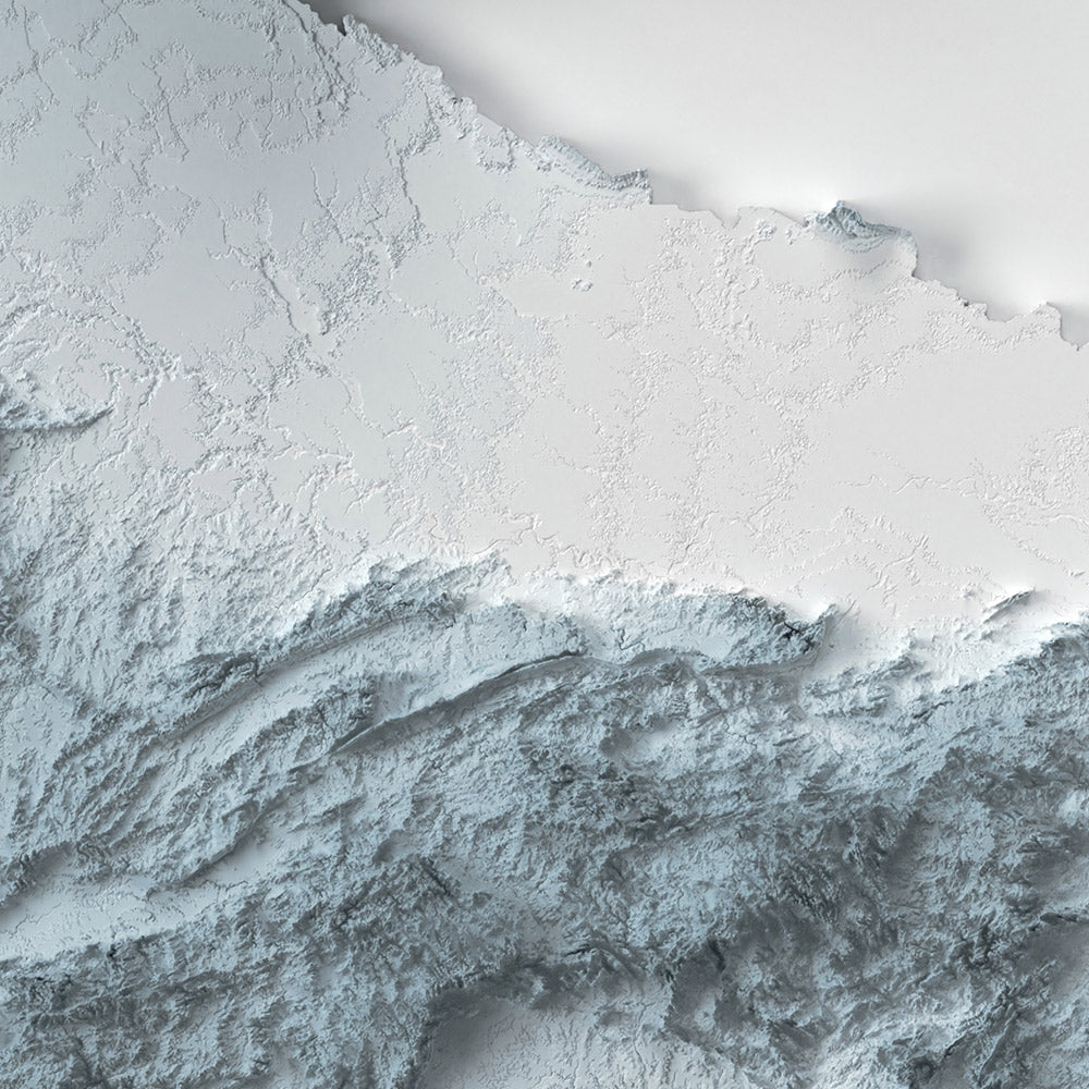 Our shaded relief prints use ultra high resolution topographic data and a secret 3D rendering process to create the illusion of raised terrain — like the mountains are about to lift right off the page. No labels, no borders, no distractions. Just the raw shape of the land, brought to life in a clean, modern style.