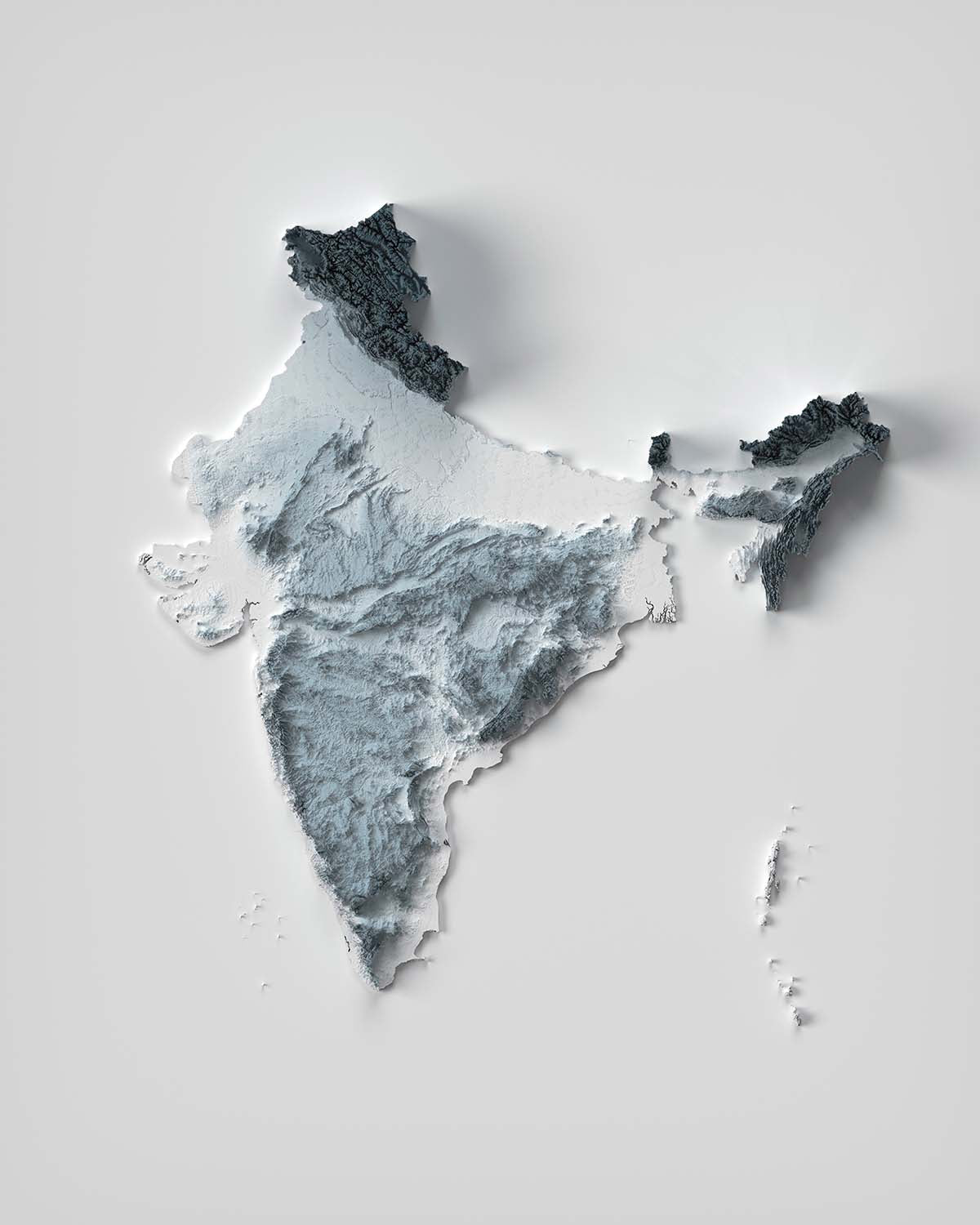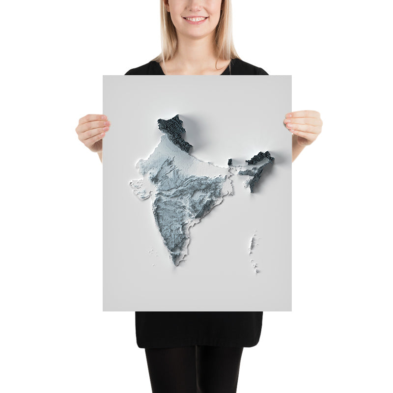 This is a minimalist topographical relief map of India, created by The Unique Maps Co. and enhanced with our trademarked Unique 3D process. There are no labels, no roads, and no towns — just the land itself, sculpted by light and shadow so that high peaks gleam and deep valleys settle into gentle shade. The effect is a quietly dramatic portrait of India’s astonishing variety of mountains, plains, plateaus, and coasts.