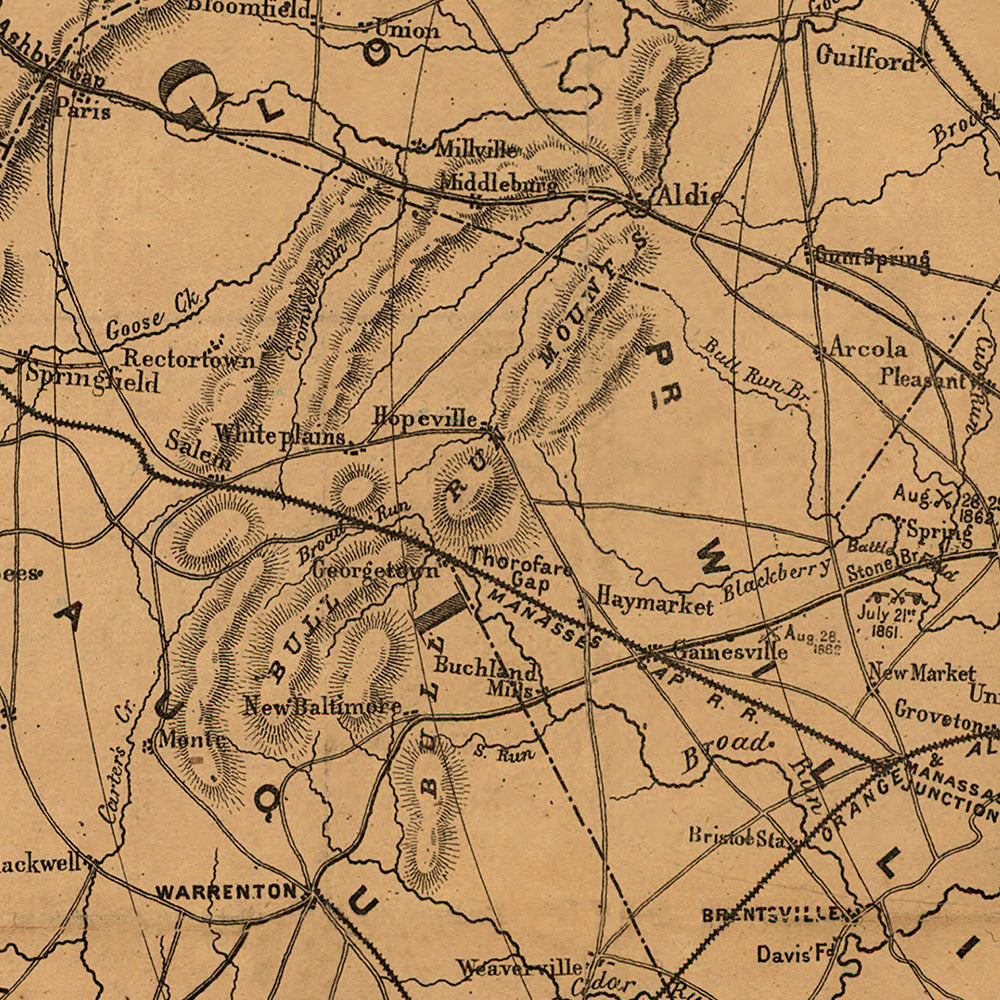 South along the Rappahannock, Fredericksburg bears Bruff’s terse annotation—“H. 2 Rebel forces, Dec. 1862”—a cartographic nod to the Confederate lines that bloodied Burnside’s assault. The map situates that catastrophe within a web of neighboring fields: the Warrenton turnpikes that once led McDowell and Pope toward Manassas, the roads through Chantilly where Jackson’s rear guard clashed, and the approaches by Leesburg into the Loudoun Valley. Elevations and hills are carefully marked, underscoring why ridges, fords, and river bluffs governed every march and artillery position. Harpers Ferry appears at the mountain gateway, its rail and canal links reminding the viewer how a small town could become a strategic prize, fall, and pivot point in successive campaigns.