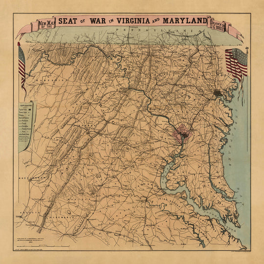 Joseph Goldsborough Bruff’s New Map of the Seat of War in Virginia and Maryland, published in 1863, captures the crucible of the Civil War at the height of uncertainty. Centered deliberately on Washington City—with concentric circles plotted at ten-mile intervals—the composition turns the capital into both geographic anchor and strategic metronome. From this hub, the map unfolds southward to Richmond and westward toward the Blue Ridge corridors, knitting together towns, courts, ferries, and crossroads whose names became dispatches. Bruff’s traditional, hand-drafted style is matched by a rigor of information: town and county labels clarified, elevations subtly modeled, roads and rivers traced with a staff officer’s eye. The result is a theater-wide briefing rendered as cartography.