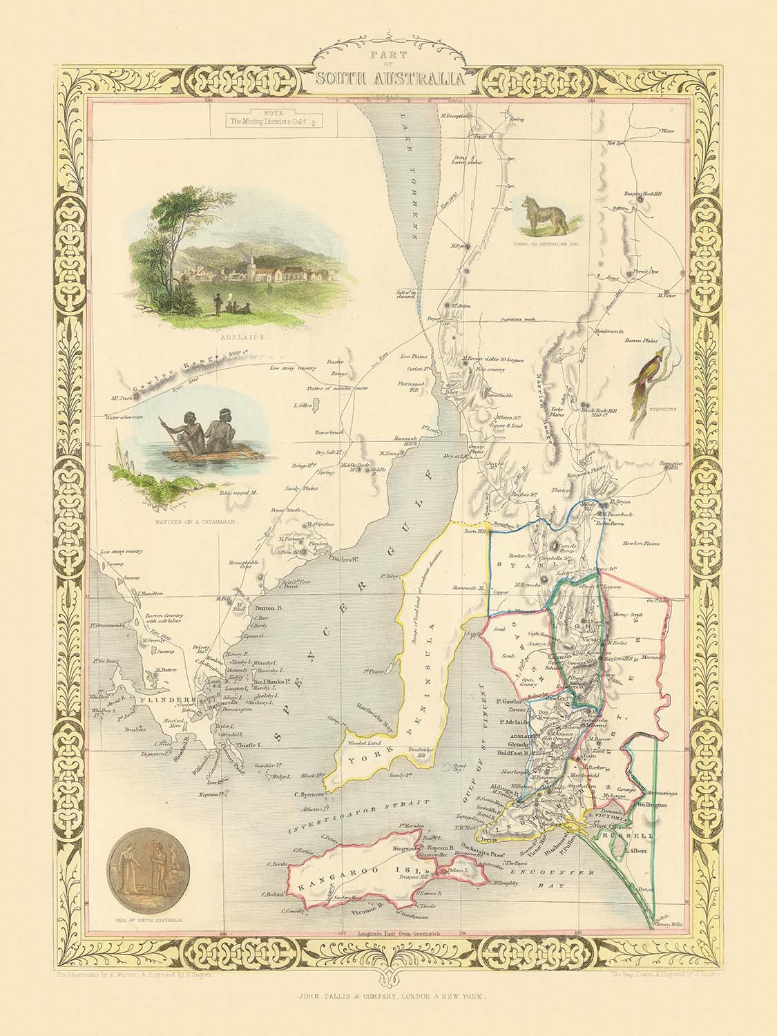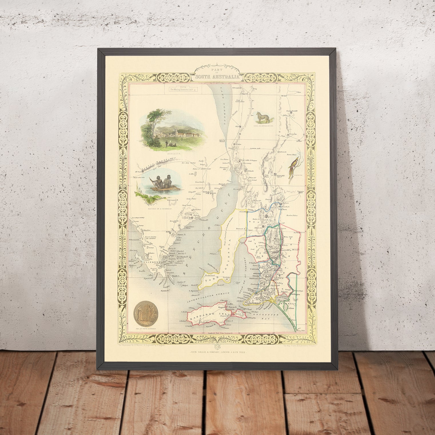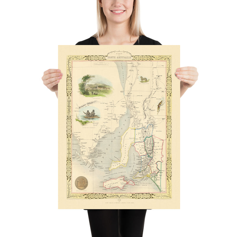Historically, the map captures South Australia at a formative moment, as survey, settlement, and commerce accelerated in step with broader currents sweeping mid-19th-century Australia. Tallis, one of the last great decorative mapmakers, distills that momentum into an atlas page where accurate delineation and narrative imagery coexist. The vignettes of Indigenous life and native fauna mirror European curiosity while acknowledging older presences and ecologies, even as the county grid records a colonial order advancing apace. As a whole, the sheet stands as a concise chronicle: a coastal dominion defined by gulfs and islands, towns tethered to harbors, and a young polity asserting itself with seals and borders. It is an eloquent summation of place, period, and the Tallis signature.