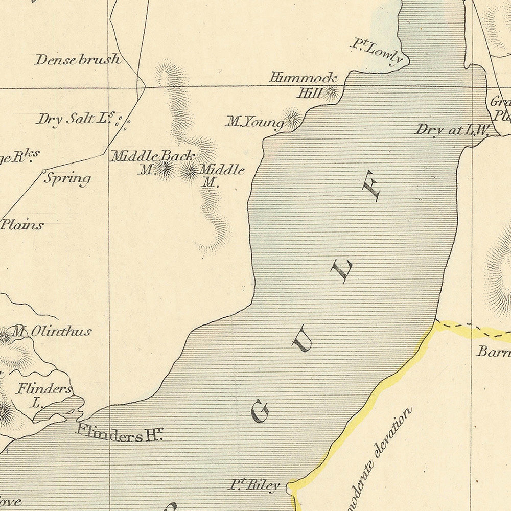 Geographically, the map excels in expressing the coast’s intricate physiognomy. The long body of Spencer Gulf carves deep into the mainland, its sheltered waters flanked by the York Peninsula to the east and a rugged western littoral running up toward Port Drummond. Kangaroo Island stands sentinel at the gulf’s mouth, a maritime landmark separating open ocean from the complex inshore waterways. The curve of Encounter Bay opens toward Victor Harbor, while smaller bays, capes, and islands on both gulfs articulate a coast alive with navigational detail. Inland, the shading and linework trace undulating terrains and watercourses, hinting at ranges and river systems that break the plains—an evocative physical backdrop to the settlements strung along the shore.