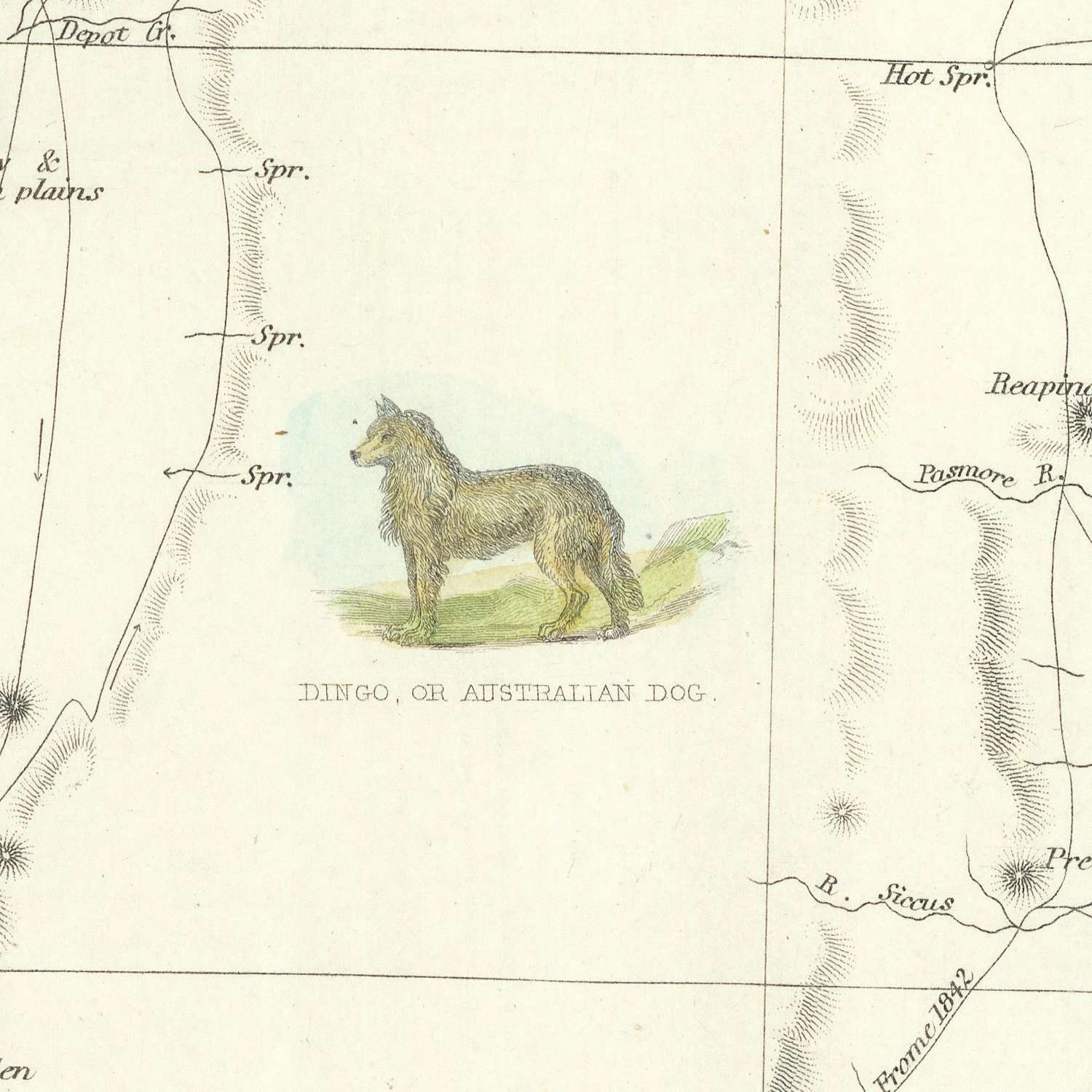 - Vignettes of Adelaide, indigenous people on a raft, a Dingo, and a Nymphicus