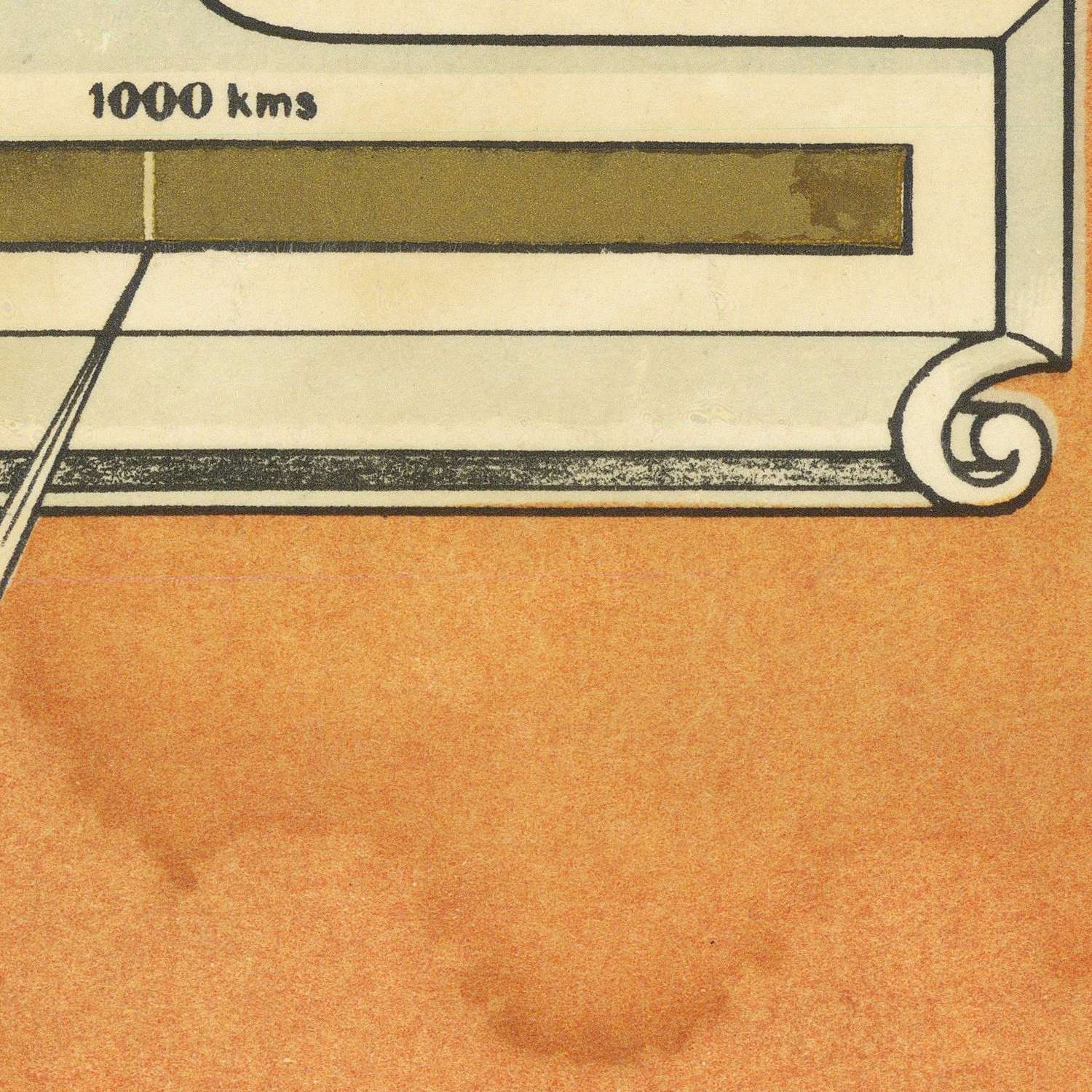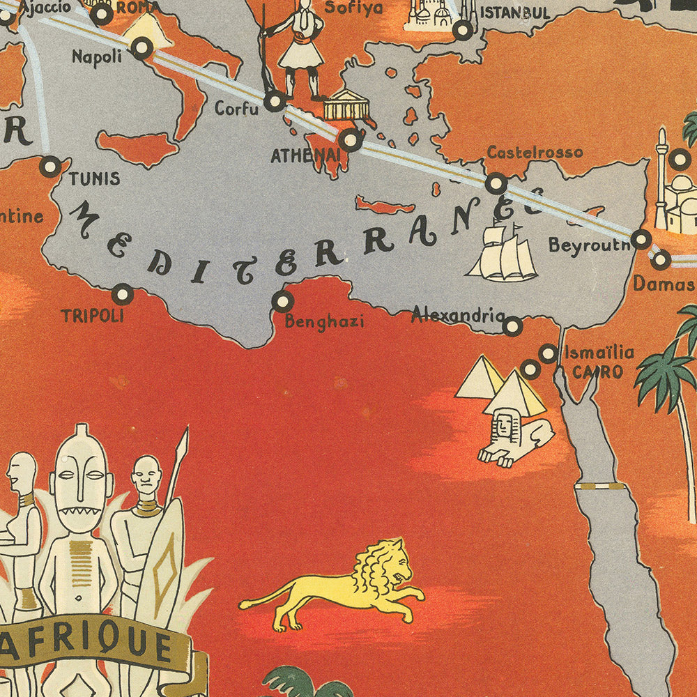 Historically, this map inaugurates Boucher’s long, defining association with Air France, setting the visual DNA that would evolve as the airline’s reach expanded. Its idiom—ornament married to operational reality—became an international signature, a way of seeing the world through the lens of flight. Later editions would fill the blank corridors with North Atlantic vectors and Indian Ocean arches, but the 1934 planisphere holds a special charge: the poised anticipation of an era on the brink of new routes and new politics. It is both a celebration of what existed and a promise of what was imminent, a luminous snapshot of aviation’s golden interwar moment.