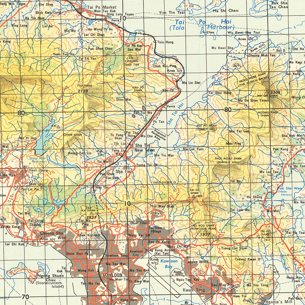 Topography takes center stage. Hills and mountains—stepping from the heights of Hong Kong Island across the Lion Rock range to the massifs of the New Territories—are rendered with elevations that make relief read at a glance. Valleys are incised by rivers and reservoirs, and the coast is laced with inlets and embayments that once dictated harbor works and ferry routes. The map’s treatment of Victoria Harbour and adjacent channels emphasizes approach lines and sheltered waters, while the northern frontier opens onto a mosaic of ridges and lowlands where settlements thread along passable corridors. This is Hong Kong as a landscape of thresholds: peaks, saddles, and straits shaping every decision about where people lived, traveled, and built.