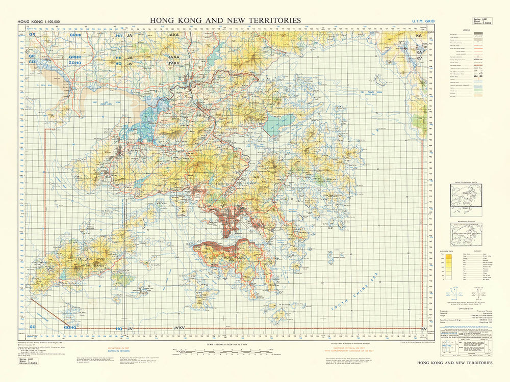 Hong Kong and New Territories is the original title of this authoritative 1970 chart, compiled by the U.K. Ministry of Defence from field surveys of 1957 and 1968–69. Conceived at a moment when Hong Kong’s landscapes were being remapped by rapid growth and strategic planning, it marries military precision with metropolitan detail. The sheet ranges from the serrated uplands guarding Victoria Harbour to the reaches of the New Territories, capturing coastlines, islands, and straits in crisp delineation. Its scarcity today stems from its planning pedigree: a scarce, working reference that documented built-up districts, active construction, and the terrain that constrained and channeled development. Color-coded topography, a disciplined grid, and lucid symbology turn a crowded, vertical city into a legible field of operations.