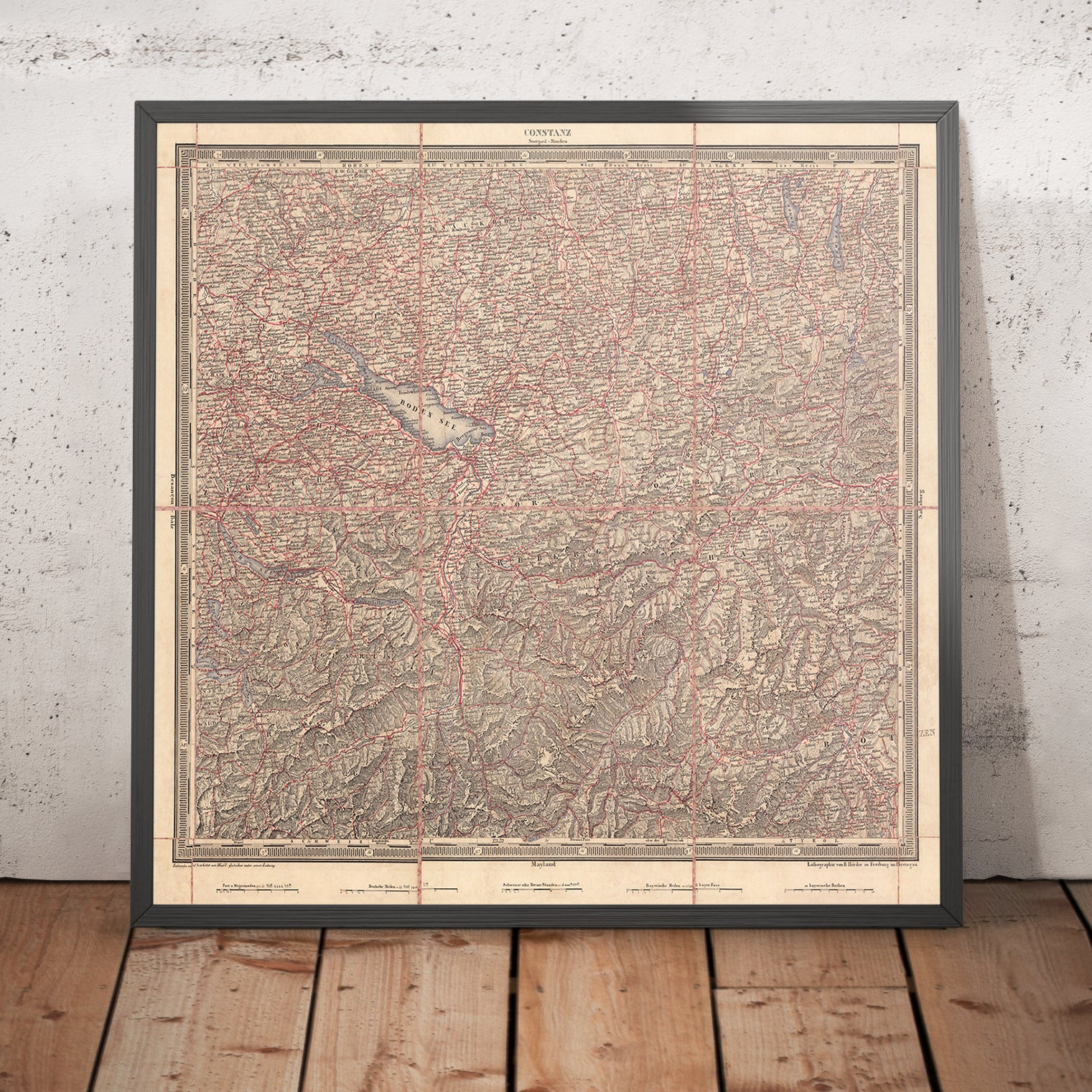 Woerl’s mastery lies in his early, assured use of two-color lithography. A red lithographic stone, overlayed with exceptional precision, brings instantaneous legibility to roads, emerging railways, and political separations, while black delineation does the work of names, contours, and hydrography. Relief is modeled with disciplined hachures that render the Black Forest’s serried slopes and the Alps’ approaching buttresses with tactile nuance. Bathymetric engraving gives Bodensee a living contour, echoing the passage of the Rhine across the basin. This modern printing sensibility—spare, functional, and beautiful—explains the map’s esteem among contemporary users and its later adoption by the German army, which prized such clarity for planning and reconnaissance.