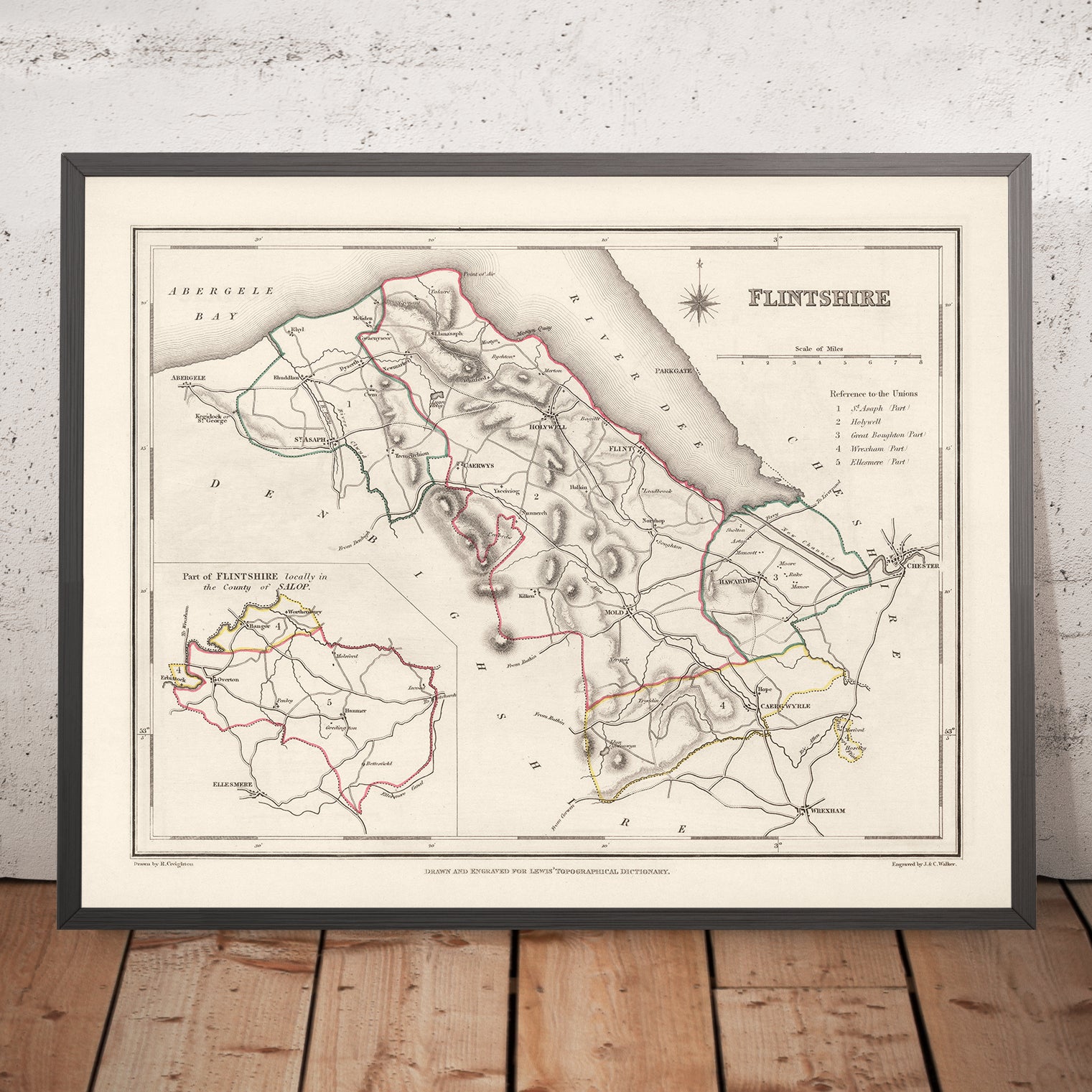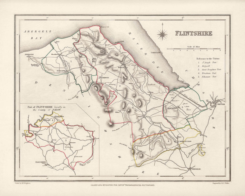 Flintshire County, created by R. Creighton and engraved by J. & C. Walker, appeared in 1844 within Samuel Lewis & Co.’s celebrated Atlas to the Topographical Dictionary of England and Wales. Conceived as both a scholarly reference and an elegant visual guide, it blends precise political delineation with a subtle portrait of landscape. Hand-colored outlines pick out county and union boundaries, while cities, boroughs, and market towns are crisply labeled along a lattice of principal roads and nascent railways. The unusual orientation—north set towards the upper right—invites a fresh reading of the borderland between Wales and England. With its refined lettering and carefully tiered symbols for settlements and landmarks, the sheet encapsulates a mid-Victorian ideal: authoritative, legible, and quietly beautiful, yet alive to the complexity of local governance and terrain.