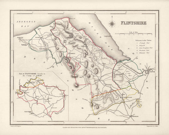 Old Map of Flintshire, Wales by Lewis, 1844: Flint, Mold, Holywell, Dee Estuary, Clwydian Hills