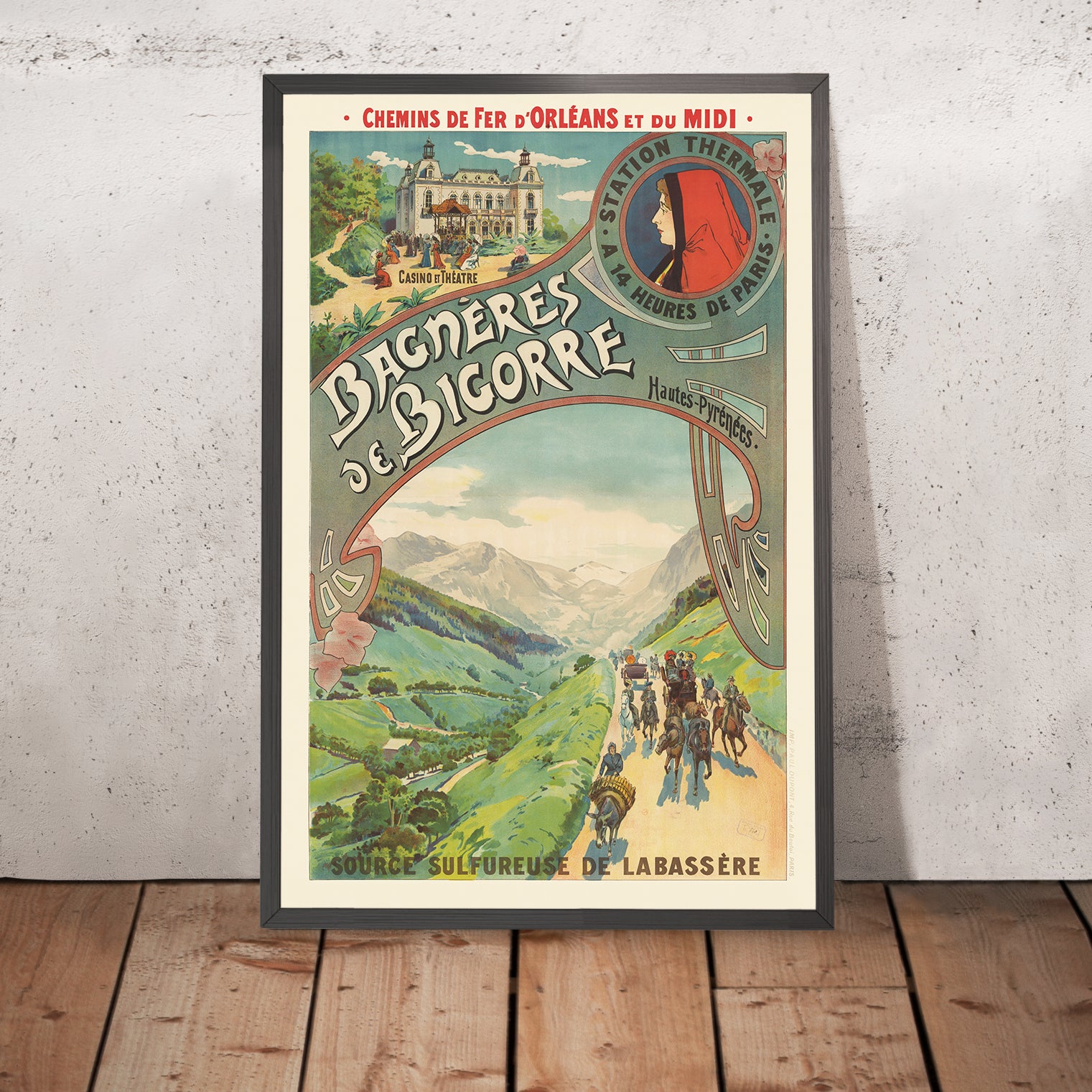 The poster’s subject places it at an important crossroads in European tourism: the expansion of the Orléans and Midi railway networks that opened the Pyrenean spa resorts to a burgeoning middle-class public. Bagnères-de-Bigorre, famed for its thermal baths and invigorating climate, drew visitors seeking restorative sojourns and scenic escapes. This advertisement speaks directly to that era’s fascination with healthful travel—making the voyage not only possible but pleasurable, with the train as the stylish conduit to alpine landscapes and leisurely promenades.