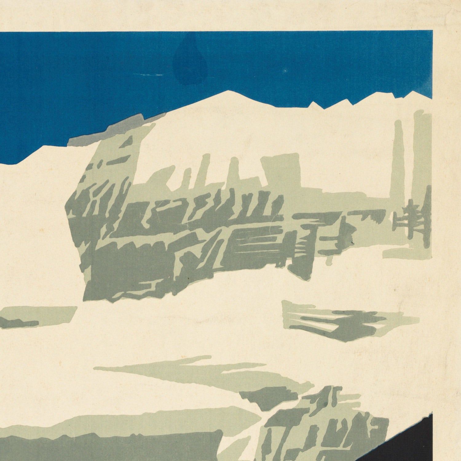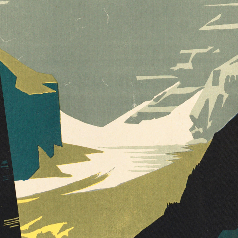 About the maker and the moment: while the artist’s name is lost to history, the work reflects the practiced hand of commercial illustrators who helped define Canada’s golden age of travel promotion. These anonymous talents worked for railways, tourism bureaus, and design studios, translating spectacular landscapes into graphically compelling invitations to explore. Their approach—clean lines, simplified silhouettes, and strong typographic presence—balanced clarity with drama, ensuring the image read beautifully from a distance.
