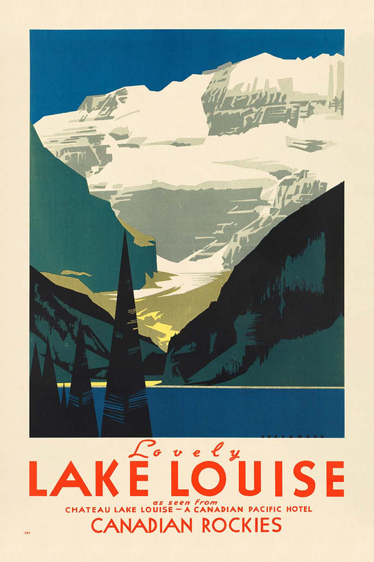 Lovely Lake Louise is a classic Canadian travel poster rendered by an unknown studio artist, capturing the tranquil majesty of Banff National Park in the Canadian Rockies. Created in the bold, streamlined spirit of early 20th-century tourism advertising, it distills a grand alpine scene into elegant, geometric forms. The poster channels the era’s optimism for modern travel—when rail lines, grand hotels, and national parks converged to make far-flung wilderness both reachable and romantic. With Lake Louise’s iconic glacier-fed waters cradled by soaring peaks, it evokes the timeless allure that has drawn visitors to Alberta for generations.