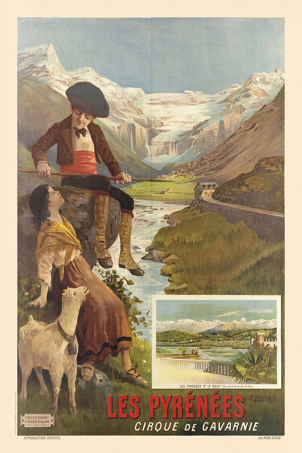Les Pyrénées – cirque de Gavarnie by F. Hugo d’Alési (Frédéric Alexianu), published in 1890, captures the romance of turn‑of‑the‑century travel at the very moment railways opened the high country to curious wanderers. Set in the heart of the French Pyrenees, the scene looks toward the famed natural amphitheatre of Gavarnie in the Hautes‑Pyrénées of southwestern France—a place of soaring limestone walls, tumbling waters, and meadows where pastoral life brushes up against the sublime. D’Alési distills that encounter into a lyrical tableau: local figures in traditional dress pause with a goat at their side, as the green valley rises to blue‑grey cliffs and snow‑touched peaks beyond.